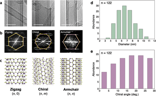 近日,东京都立大学Yasumitsu Miyata和Yusuke Nakanishi合作报道了以氮化硼纳米管(BNNT)为模板的SW-TMDNTs的结构多样性。BNNTs的外表面和内腔促进并稳定了各种直径的SW-TMDNTs的同轴生长。几纳米宽MoS2NTs可以通过保护性BN 护套来稳定,以便对其进行表征。通过HRTEM确定了单个SW-MoS2NTs的手性指数(n,m),统计分析显示了广泛的手性分布,从Z字形到扶手椅构型。此外,模板反应可应用于各种TMDNTs的合成,如硒化物(MoSe2和WSe2)合金Mo(1-x)WxS2和Janus MoS2(1-x)Se2x。综合显微镜和光谱分析还表明了Janus MoS2(1-x)Se2x纳米管的部分形成。BNNT模板反应提供了一个通用的平台,以表征具有各种电子结构的1D纳米管的手性相关性质。