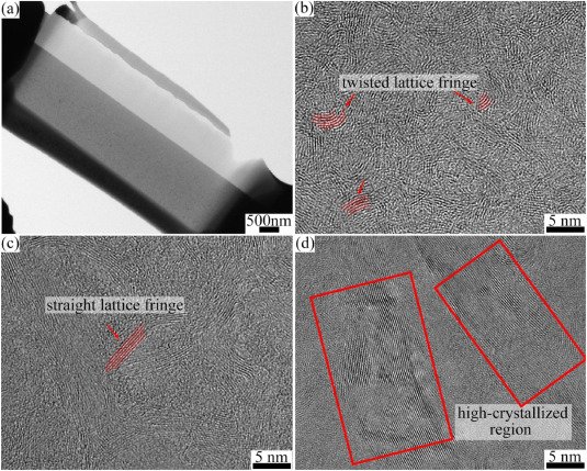 利用聚焦离子束制备TEM样品,通过TEM来表征样品的微观结构,以进一步研究两个界面之间的结构差异。图2a显示,不同相之间存在清晰的边界。可以测量沿方向的平面尺寸(La)和沿方向的堆叠厚度(Lc),以评估BN的结晶度。如图2b所示,低压沉积的BN1是准各向同性的,具有扭曲和混沌的晶格条纹。Lc小于10层。沉积压力增加后,BN2的结构有序度较BN1提高。图2c显示了靠近SiC纤维的BN结构。晶格条纹无序堆叠,但保持相对平直。La和Lc明显增加。图2d中,外BN界面的结晶度进一步提高,出现了具有几十层的高结晶区域。