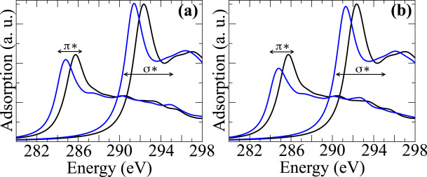 图11显示了原始石墨烯(实心黑线)的模拟C K边缘光谱,以285.8和292.4eV处的C-1s→π*和→σ*跃迁为特征。这导致6.61eV的峰间差[ΔEPP=E(σ*)-E(π*)],与实验测量结果一致。在该序列中,计算了石墨烯碳原子在G/h-BN/和h-BN/G/SiC(蓝色实线)中的吸收光谱。与最近h-BN在G/SiC上的XANES实验结果一致,发现石墨烯碳原子保留了C-1s→π*和→σ*吸收特征及能量差ΔEPP,支持了G和h-BN层之间的vdW相互作用。与原始石墨烯相比,发现G/h-BN/SiC和h-BN/G/SiC的吸收光谱降低了约1eV,其中C-1s→σ*吸收特征保留,但两者的C-1s→π*光谱表现出不同的特征。在G/h-BN/SiC中,由于石墨烯片位于h-BN/SiC表面,吸收特征几乎与原始系统的吸收特征相同,而在h-BN/G/SiC中,发现h-BN封装石墨烯后,吸收光谱的强度降低。