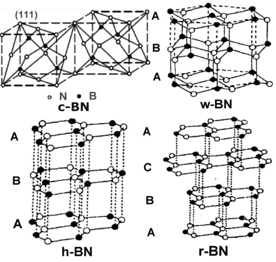氮化硼(BN)是由氮原子和硼原子通过不同杂化方式所构成的晶体。BN晶体主要有四种不同的变体:具有sp3杂化B-N键的立方氮化硼(c-BN)和纤锌矿氮化硼(w-BN),以及具有sp2杂化B-N键的六方氮化硼(h-BN)和菱方氮化硼(r-BN)。其中h-BN和c-BN为热力学稳定结构,r-BN和w-BN为亚稳态结构。不同结构的氮化硼材料表现出不同的性质,通常,氮化硼材料的化学稳定性高,抗氧化能力强,这些性质使得不同结构的材料都有着十分独特的应用价值。