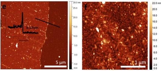 图4展示了hBN薄膜的AFM图和线扫描轮廓(e)及hBN薄膜的AFM特写图(f)。薄膜的清晰边缘使得能够进行非常精确的AFM测量,平均厚度为∼3nm,均方根粗糙度为3.5 nm(图4 e)。图4f中AFM特写图显示了转印过程后这些薄膜中出现了典型褶皱,还可以注意到偶尔出现的微小白点。