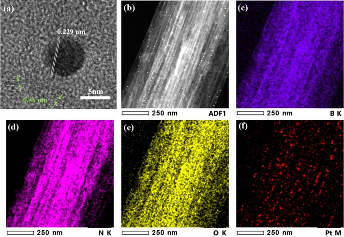 如图3所示,样品在BN纳米带气凝胶的纳米孔处显示出均匀的Pt NPs(平均直径5-10nm)。Pt2/BN-na样品的元素分布进一步表明,Pt NPs是均匀且高度分散的(图3c-f)。Pt NPs的两个原子平面距离测量为0.229nm(图3a),与Pt金属沿[111]方向的晶格间距一致。BN-na(002)平均晶面距离为0.36nm,略大于体相h-BN(0.34nm),显示出具有丰富位错结构的涡层BN相。这些具有更多BOx和B-OH种类的位错结构可能是高度分散的Pt NPs的理想锚定位点。
