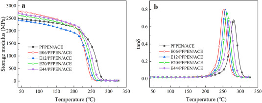 对改性树脂进行DMA测试,以研究不同EP树脂的热机械性能。如图7a所示,除E12外,EP树脂的加入提高了改性树脂在30°C下的储能模量(E′)。在室温下,固化材料的分子网络结构被认为处于冷冻状态。然而,EP树脂的引入减少了缺陷和空隙,同时增加了分子堆积密度,从而提高了改性树脂在室温下的储能模量。在230°C的高温下,冻结分子链开始再次移动,最终导致处于弹性阶段的E′减少。此外,图b中所示的tanδ曲线,表明EP树脂也会导致固化材料的Tg发生不同程度的降低。这是由于加入EP树脂,导致交联密度(ve)和三嗪环形成量的降低。