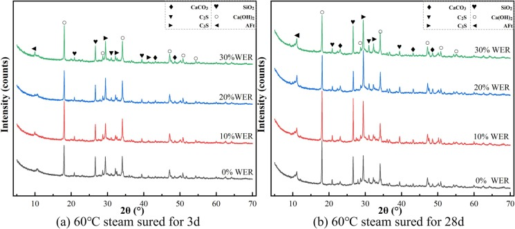 图2. BPBO的1H NMR和13C NMR光谱图3a显示,在60°C下蒸汽固化3天后,复合材料和空白组的图几乎相同。水泥水化产物的峰,如钙明矾(AFt)和Ca(OH)2衍射峰,以及未水化的C3S和C2S衍射峰比较明显。表明砂浆中存在未脱水的水泥颗粒。此外,C3S和C2S衍射峰的强度随着环氧树脂含量的增加而增加,表明未水化水泥的含量增加。因此,加入WER阻碍了水泥的水化,并且在更高的剂量下阻碍作用更显著。在60°C下固化28天的XRD图与固化3天相似。水泥水化产物的特征峰不同。然而,固化28天样品的钙明矾(AFt)的衍射峰强度更高,表明石膏和C-S-H之间的反应增强。Ca(OH)2和CaCO3峰强度也较高,C3S在2θ=41.2°处的衍射峰消失,表明碳化加深,水泥水化完全。结果表明,环氧树脂的加入在早期减缓了水泥水化过程。减缓程度与所加环氧树脂的量成比例。然而,随着时间增加,减缓作用逐渐减弱并最终消失。