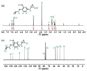 图2d显示了BPBO的1H NMR光谱,存在环氧基上H的特征峰,分别位于3.19-3.11ppm、2.85-2.74ppm和2.55ppm;相比于MOMP的1H NMR光谱中,炔丙基的亚甲基和甲基上H的化学位移分别出现在4.75ppm和2.50ppm。在BPBO的13C NMR光谱中(图2e),52.56ppm和46.85ppm处的特征峰代表环氧基上C的化学位移,这在MOMP的13C NMR光谱中不存在。炔基和炔丙基亚甲基上C的化学位移分别出现在78.68ppm、75.74ppm和56.83ppm。结果表明BPBO被成功合成。