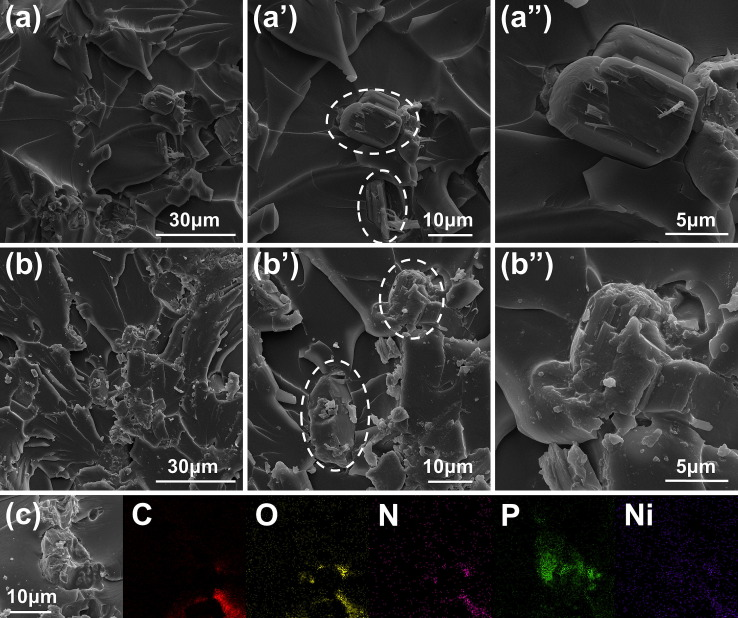 通过SEM观察样品的断裂形态,如图9所示。对于6APP/EP,APP与环氧基体之间存在明显的缝隙,并且表面APP颗粒光滑,表明APP与EP之间的界面相互作用较弱。相反,6NicNi@APP/EP没有出现间隙,断裂表面呈现出更粗糙和崎岖的形态,这意味着需要更多的能量来引发裂纹和机械损伤。环氧树脂基体中NicNi@APP表面似乎变得粗糙,以及NicNi@APP表面上凸起的NicNi颗粒消失,表明NicNi@APP和环氧树脂基体之间界面附着力强,这应该与NicNi@APP、DETA和环氧基的界面反应有关。因此,APP与环氧树脂的界面粘附性增强,与Ni2+的界面配位反应密切相关。此外,6NicNi@APP/EP显示Ni元素分布均匀,无明显聚集,与磷的积累不同,以及C元素在APP表面稀疏分布,进一步证明了上述推导。因此,上述分析表明NicNi@APP,DETA和DGEBA的界面反应实际存在于NicNi@APP/EP,导致Ni2+同时与HNA和羟基配位,这有利于增强APP在环氧树脂基体中的界面相容性。
