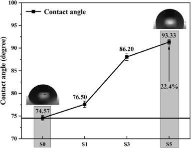图10. 不同复合材料的HRR、THR、SPR、TSP、CO和CO2曲线接触角通常用于衡量涂层的疏水性。如果接触角<90°,那么涂层是亲水性的,如果接触角>90°,涂层则是疏水性的。如图所示,纯环氧树脂涂层S0的接触角为74.57°,属于亲水性涂层。随着Ni@NC/CNT纳米复合材料加入量的增加,复合涂层的接触角逐渐增大。此外,当Ni@NC/CNT纳米复合材料的加入量为5wt%,复合涂层S5的接触角为93.33°,比纯环氧树脂涂层S0的接触角高25.2%。同时,涂层变得疏水。涂层接触角的改善主要是由于Ni@NC/CNT纳米复合材料中衍生CNT的疏水性。将Ni@NC/CNT复合材料加入到环氧树脂基体中,可以有效防止水分子渗透到涂层中,大大提高了水泥材料的抗渗性能。