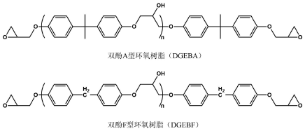 环氧树脂(Epoxy Resin,EP)是一种高交联热固性聚合物,分子式为(C11H12O3)n,是分子中含有两个或两个以上的环氧基团,并在适当条件下能与固化剂反应,形成三维交联网络状固化物的总称。环氧树脂的种类繁多,具有多种不同的分类方法,合理的分类方式有利于研究环氧树脂的固化性能。其中,双酚A缩水甘油醚(DGEBA)和双酚F缩水甘油醚(DGEBF)是目前市场上最常用的环氧树脂,二者的分子结构式如下图所示。