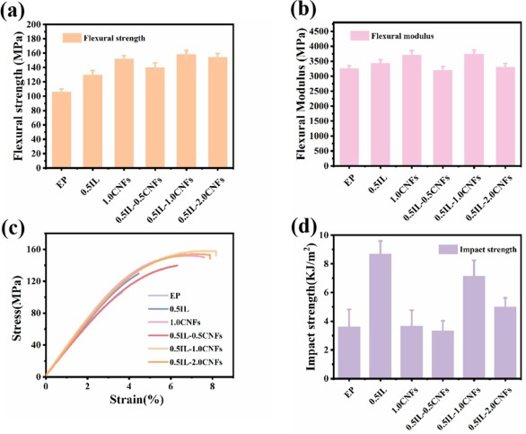 图8. EP复合材料的弯曲强度,弯曲模量,弯曲应力-应变曲线和冲击强度