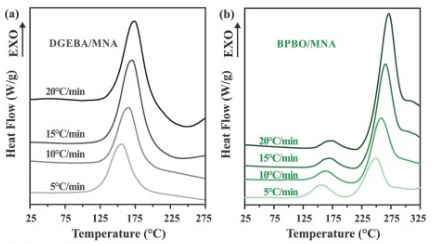采用非等温DSC研究了DGEBA/MNA和BPBO/MNA的固化行为。图5a中DGEBA/MNA的DSC曲线只表现出一个放热峰,反映了环氧基和酸酐的开环聚合。而BPBO/MNA(图5b)有两个峰,对应于固化过程中发生的两种反应,以形成特殊的交联网络。一种是环氧基和酸酐之间的反应(在155-176°C左右出现反应峰),另一种是炔丙基单元的交联显示出更高的反应峰温度(249-270°C)。