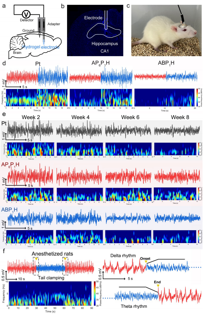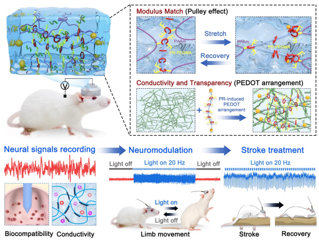 神经探针是神经信号记录和神经调控的关键部件。神经探针的性能与其生物相容性、导电性和透明度等内在特性密切相关。传统的可植入式探针仍然以硅、金属或金属氧化物材料为基础。尽管这些探针具有良好的导电性,但其弹性模量(>100 GPa)远高于脑组织的弹性模量(1-3 kPa)。当这些刚性探针植入脑组织时,严重的机械不匹配会导致神经胶质细胞迁移,神经胶质细胞会覆盖电极表面。电极表面的神经胶质细胞会阻碍电子传递,导致脑信号随时间衰减。机械不匹配还会造成刚性探针与脑组织之间的微运动,破坏神经组织并产生相应的免疫反应。此外,基于金属的电极由于能带间隙较小,在光遗传神经调控过程中会产生光电伪影,从而导致信号噪声和错误结果。为了降低弹性模量,可通过在柔性基底上沉积导电层来制造柔性电极。然而,与脑组织相比,它们仍然表现出更高的模量。水凝胶因其富含水的三维结构,可以模拟脑组织的物理化学特性。因此,水凝胶可用作神经探针来获取神经信息。
