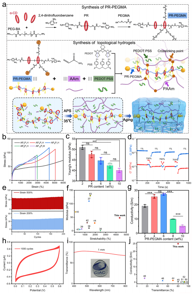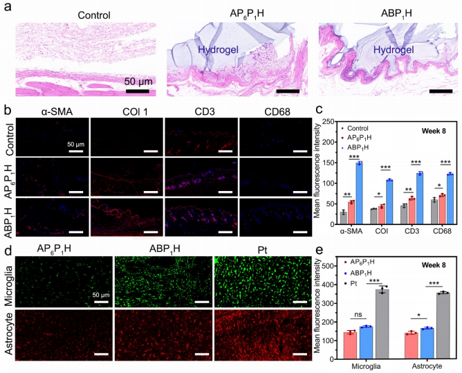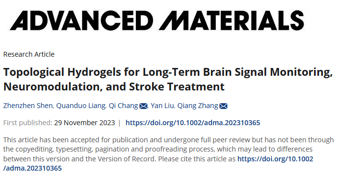 在这项工作中,中国科学院长春应用化学研究所张强团队在拓扑水凝胶中加入了机械互锁的聚轮烷,通过聚轮烷的滑轮效应在分子水平上解决了这两个权衡问题。拓扑水凝胶的独特性能使其能够获取大脑神经信息并进行神经调控。该探针能够连续记录局部场电位长达 8 周。利用该探针实现了初级运动皮层的光遗传学神经调控,从而调节大脑神经回路并控制肢体行为。最重要的是,利用该探针进行的光遗传学神经调控有效缩小了脑组织的梗死区域,促进了运动功能的恢复。这项工作表明,神经探针的设计理念在开发脑机接口和寻求脑疾病疗法方面取得了重大科学进步。相关研究工作以“Topological Hydrogels for Long-Term Brain Signal Monitoring, Neuromodulation, and Stroke Treatment”为题发表在顶级期刊《Advanced Materials》上。祝贺!图1. 拓扑水凝胶结构、性能和作为植入式神经探针的应用示意图本研究从水凝胶固有特性的角度出发,设计了拓扑水凝胶来克服这些挑战(图 1)。在水凝胶中使用了一种机械互锁的聚轮烷(PR-PEGMA)作为交联剂,以产生较大的移动连接构象自由度。PR-PEGMA 包含一个聚乙二醇 (PEG) 主干和 15 个带有 PEG 甲基丙烯酸酯 (PEGMA) 侧链的环糊精 (CDs)。15 个 CD 由 PEG 主干串联,然后由大基团封端。CD 交联点像滑轮一样沿着 PEG 链自由滑动,从而消散了外加应力并产生了较大的应变,从而获得了较低的弹性模量和较高的强度。预计该弹性模量与脑组织的弹性模量相匹配,因此使用拓扑水凝胶可获得与脑组织良好的生物相容性。聚(3,4-亚乙基二氧噻吩):聚(苯乙烯磺酸盐)(PEDOT:PSS)被用作水凝胶中的导电填料,以获得良好的导电性。据报道,PEG 链可诱导 PEDOT 沿 PEG 链排列,从而提高其导电性。图2. PR-PEGMA 和拓扑水凝胶的合成、性能图3. 对照组、ABP1H 和 AP6P1H 样品植入大鼠背侧皮下组织的生化性能反映生物相容性是植入材料的一项重要要求,与长期稳定性和异物反应密切相关。将 AP6P1H 和 ABP1H 水凝胶薄膜(直径:5 mm,厚度:1.0 mm)植入大鼠皮下 8 周,以研究体内免疫反应。使用苏木精和伊红(H&E)染色进行的组织学分析表明,AP6P1H 在 8 周的植入过程中免疫反应微乎其微,而 ABP1H 则表现出明显的炎症反应。这一现象表明 AP6P1H 具有良好的生物相容性(图 3a)。然后,他们对周围组织中的四种典型生物标记物进行了免疫荧光分析,以进一步评估免疫反应:α-平滑肌肌动蛋白(α-SMA)、I型胶原(Col 1)、T细胞标记物(CD3)和巨噬细胞标记物(CD68)。AP6P1H 界面的组织在植入 8 周后显示出与对照组相似的四种生物标记物表达。为了进行比较,对靠近 ABP1H 的组织中四种生物标记物的表达进行了表征,如图 3b 和 3c 所示。与 AP6P1H 组相比,ABP1H 组的生物标志物表达量更高。这些结果表明 AP6P1H 具有抑制炎症和防止纤维组织在植入部位周围生长的能力。随后,AP6P1H探针被植入大鼠的海马CA1区,以进一步评估免疫反应。与此同时,在相同条件下还对铂电极和 ABP1H 电极的免疫反应进行了比较研究。植入 8 周后,对海马组织和电极之间的界面区进行切片,并用于免疫组织化学染色。一般来说,神经胶质细胞(小胶质细胞和星形胶质细胞)会在生理免疫反应的作用下迁移到异物上。神经胶质细胞在电极周围形成胶质鞘,以保护周围的神经组织,从而导致信号逐渐衰减。由于模量不匹配,铂电极诱导大多数神经胶质细胞迁移。与铂和 ABP1H 相比,AP6P1H 周围的神经胶质细胞要少得多(图 3d 和 3e)。AP6P1H 诱导的所有生物标志物水平最低,胶质细胞数量最少,这验证了 AP6P1H 极佳的生物相容性。图4. 拓扑水凝胶神经探针在脑神经信号监测中的应用AP6P1H 具有良好的生物相容性和高导电性,可长期记录大脑深部神经信号。局部场电位(LFP)是指神经元周围细胞外空间的电位,它反映了深部脑组织中神经元的活动信息,有别于脑电图和皮层电图。LFPs 可用于研究认知过程的内在机制以及癫痫等神经系统疾病的病理生理学。首先,使用 AP6P1H 记录 LFPs 以评估水凝胶的性能。他们设计并制作了一个带有 AP6P1H 和参比电极的装置,并将其固定在大鼠头骨上,以获得稳定的 LFP 信号(图 4a-4c)。AP6P1H 电极的制备方法是将 AP6P1H 嵌入柔性聚四氟乙烯微管中,这样可以屏蔽其他神经网络的电信号,只允许信号从微管尖端部位进入。如图 4d 所示,使用 AP6P1H 获得了明显的θ(θ)振荡节律(4-12 Hz)。θ节律与大鼠的探索行为、空间记忆和学习过程密切相关。用 AP6P1H 还记录了处于睡眠状态的大鼠的 LFP 信号,结果显示θ 节律的振幅和功率更大。这一现象源于同步神经活动,而同步神经活动在维持和终止深度睡眠中发挥着极其重要的作用。为了进行比较,他们制备了 Pt 电极和 ABP1H 电极,并在相同条件下记录 LFP。Pt 电极获得的 LFP 信号显示出最高的振幅,这归功于 Pt 的出色内在导电性。ABP1H 电极获得的 LFP 信号与其他两个电极相比最弱,原因是其电导率较低。一般来说,神经调控和脑部疾病治疗需要长期应用植入脑组织的神经电极。通过连续记录处于睡眠状态的大鼠的 LFP 信号 8 周,研究了这些电极的长期适用性。如图 4e 所示,前 4 周使用 Pt 电极可获得最大振幅的 LFP 信号。随着时间的推移,信号逐渐减弱,在第五周后,信号变得比 AP6P1H 电极记录的信号弱。AP6P1H 电极获得的 LFP 信号相对稳定,第五周后,与 Pt 和 ABP1H 电极记录的信号相比,AP6P1H 成为最强的信号。在整个 8 周内,ABP