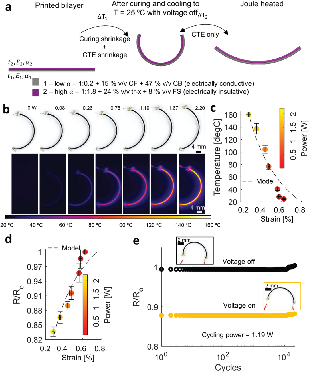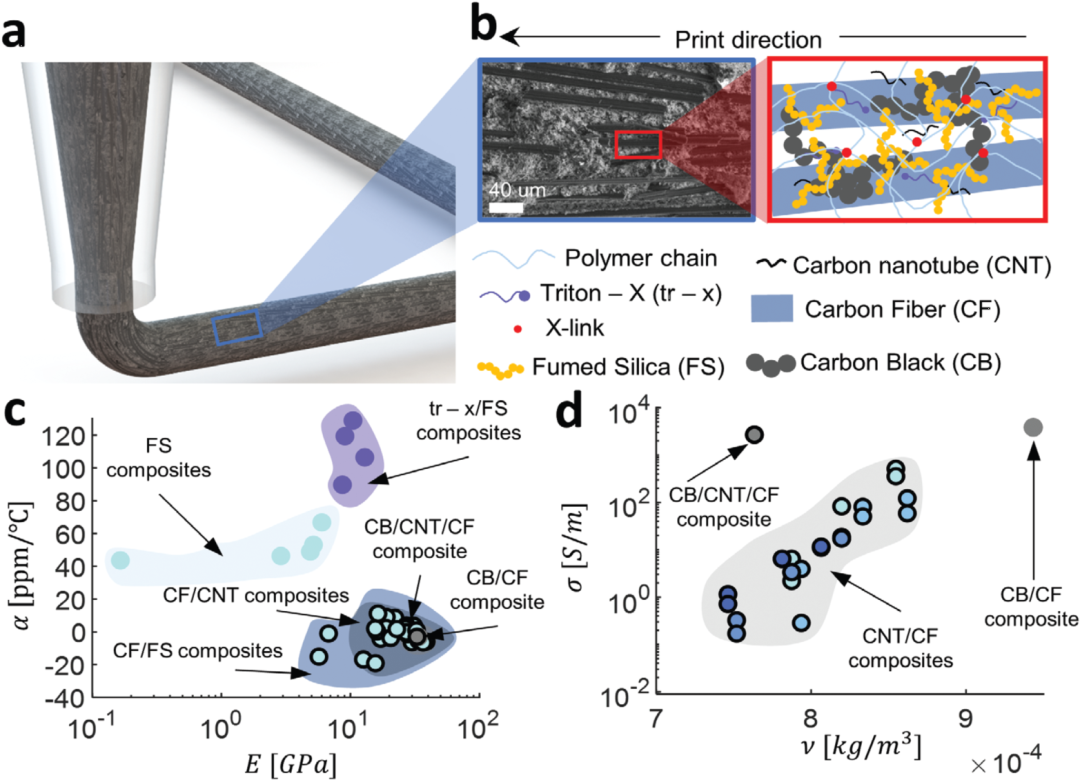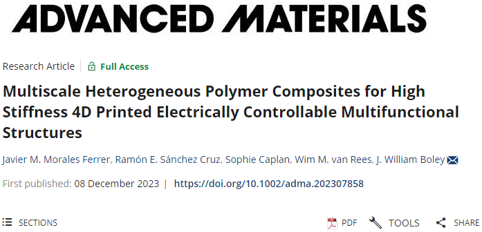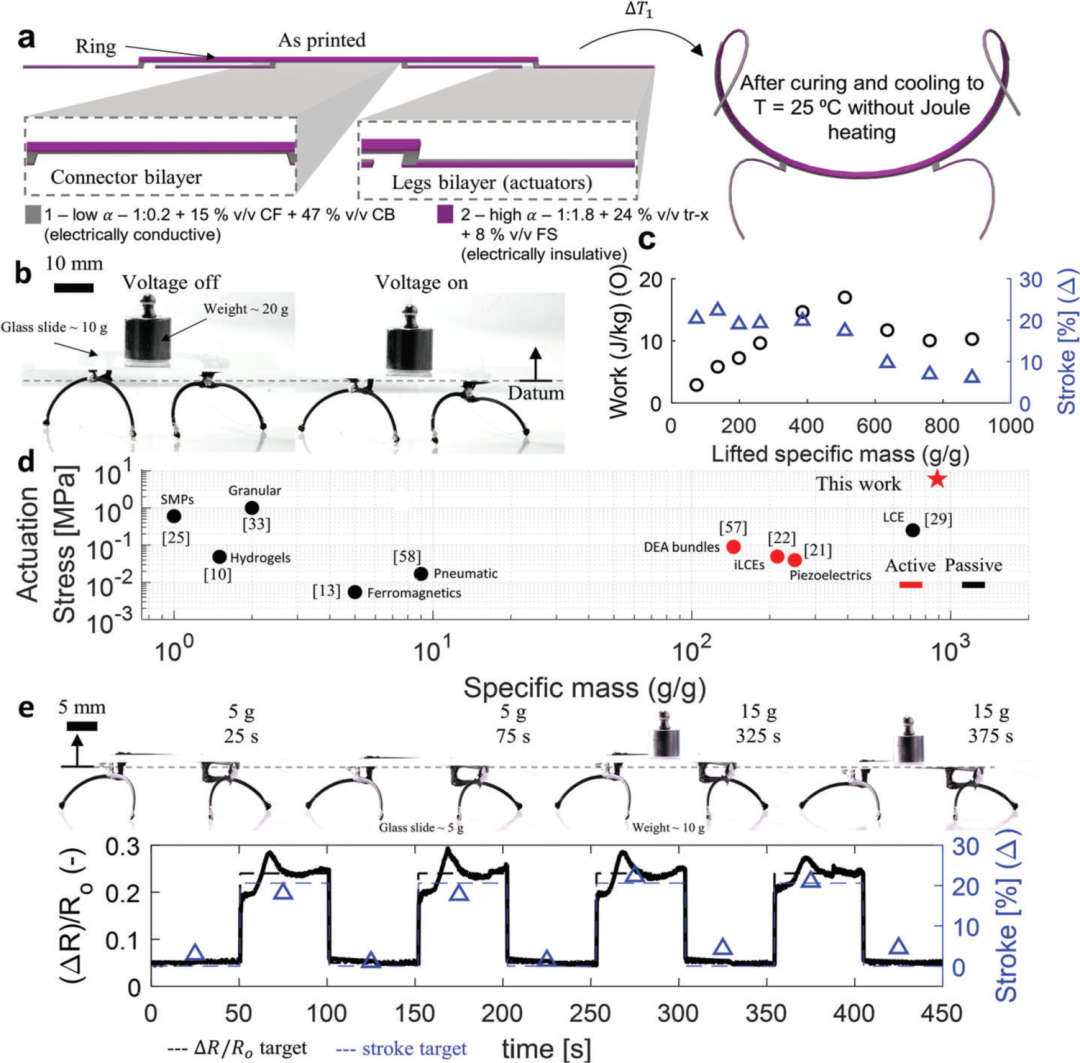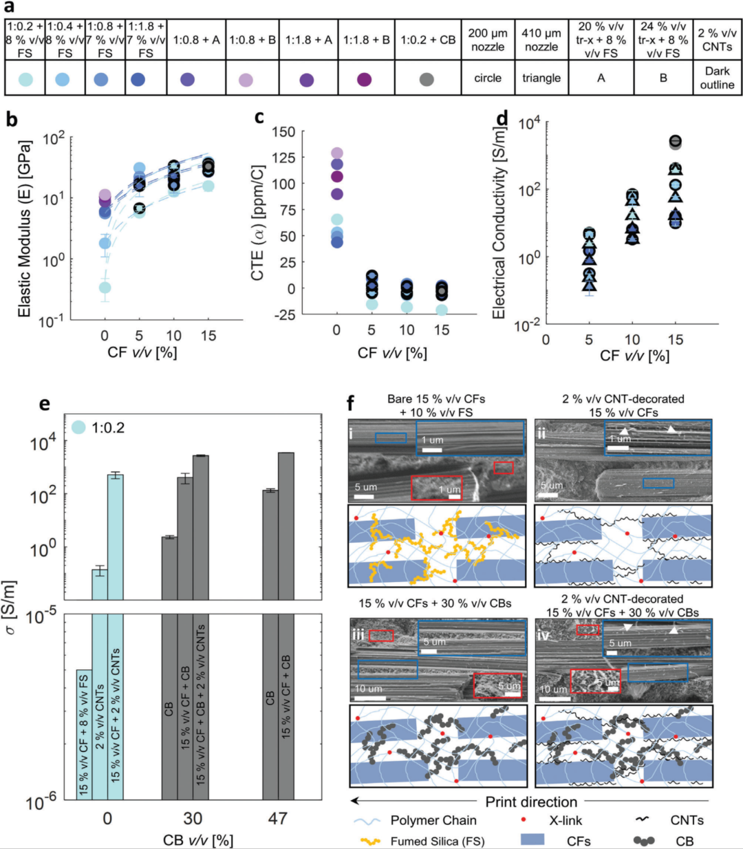 在过去十年中,响应材料,由于其在智能材料系统中的多功能应用,成为研究人员的焦点。因此它们能够响应温度、电场或磁场的变化等刺激而改变形状,因此被定义为智能系统。尤其在一系列应用中都表现出了潜力,如能量采集系统、智能致动器、智能纺织品,甚至在机器人外骨骼开发中。常用的响应系统有压电体、磁致伸缩材料、气动系统、介电弹性体和形状记忆合金(SMAs)。特别是SMAs,由于其能够通过焦耳加热实现局部致动,和固有的高致动应力,作为响应应用的首选材料脱颖而出。然而,需强调的是,SMAs最大挑战之一是有限的复杂性,最新进展是利用3D打印技术来应对这一挑战。尽管取得了一些进步,但由于形状记忆效果不足,3D打印SMA仍有实际局限性。此外,无论是采用传统制造方法还是3D打印,SMAs始终表现出低重复性、低可逆性,并且在制造之前或之后需要额外的预编程步骤。该过程需要将SMAs配置为目标形状,将其加热至马氏体相(≈500°C)以上,随后冷却至奥氏体相(约25°C)。鉴于这些挑战,迫切需要这样的材料,其具有响应性和增强的可逆性,与制造方法无缝对接,以实现复杂的形状变化。3D打印的刺激响应材料可以产生变形和多功能结构,4D打印是一个特别有前景的新兴领域,以时间为第四维度。这种方法能够对预先编程的响应片材进行3D打印,其在暴露于外部刺激时转变为复杂表面,从而大幅减少材料消耗和打印时间(70-90%)。然而,目前用于4D打印的材料通常是柔软的,如水凝胶、形状记忆聚合物(SMPs)、液晶弹性体(LCE)和聚(二甲基硅氧烷)(PDMS),在形变过程中弹性模量(E)范围为10-4-10 MPa,这限制了所得结构的可扩展性、致动应力和承载能力。为了克服这些限制,美国波士顿大学J. William Boley介绍了多尺度非均质聚合物复合材料作为一种新型的刚性、热响应4D打印材料。这些油墨的弹性模量比现有4D印刷材料大四个数量级,并提供可调的电导率,同时实现焦耳加热致动和自感测能力。利用电控双层作为构建块,设计并打印了一种变形为3D自立式提升机器人的平面几何结构,与其他3D打印致动器相比,创下了重量归一化提升载荷和致动应力的新纪录。此外,该墨水调色板用于创建和打印平面晶格结构,其转变成各种自支撑的复杂3D形状。这些贡献被集成到一个4D打印的电控多节爬行机器人晶格结构中,可以承载自身重量的144倍。相关研究工作以“Multiscale Heterogeneous Polymer Composites for High Stiffness 4D Printed Electrically Controllable Multifunctional Structures”为题发表在国际顶级期刊《Advanced Materials》上。这项工作介绍了多尺度非均质聚合物复合材料,作为一种新型的刚性、电控4D打印材料(图1a)。因为它们含有多种成分,包括交联密度可调的聚合物基质,以及各种各向同性和各向异性的纳米级和微米级填料,所以称这些复合材料为非均质复合材料(图1b)。利用该平台,产生了一组37种油墨,涵盖了广泛的负和正线性热膨胀系数(-19.1±0.3-128.8±1.2ppm°C-1)(图1c)。这套油墨的E范围比现有4D打印材料的E范围(0.34±0.1-38.6±1.4GPa)大四个数量级(图1c),并提供可调的电导率(0.7±0.1-3.5×103±9.9Sm-1)(图1d),以同时实现焦耳加热驱动和自感测能力,并保持最先进水平的热响应性(图1c)。利用电控双层作为构建块,研究者设计并打印了一个平面几何形状,其形状可变成了一个3D自立式提升机器人,与其他3D打印致动器相比,创下了提升能力(≈888倍于其自重)和致动应力(≈6MPa)的新纪录。将这种升降机器人与闭环控制系统集成,实现了自动调节驱动,表现出4.8%的过冲和0.8%的下冲,同时有效地抑制了高达机器人重量170倍的干扰,从而创造了性能的新纪录。此外,使用墨水调色板来创建, 以及3D打印转换成各种自支撑复杂3D表面的平面晶格结构。最终,使用新墨水调色板来实现4D打印的电控多节爬行机器人晶格结构,具有电粘合脚,突出了其运输负载的能力,高达其自身重量的144倍。