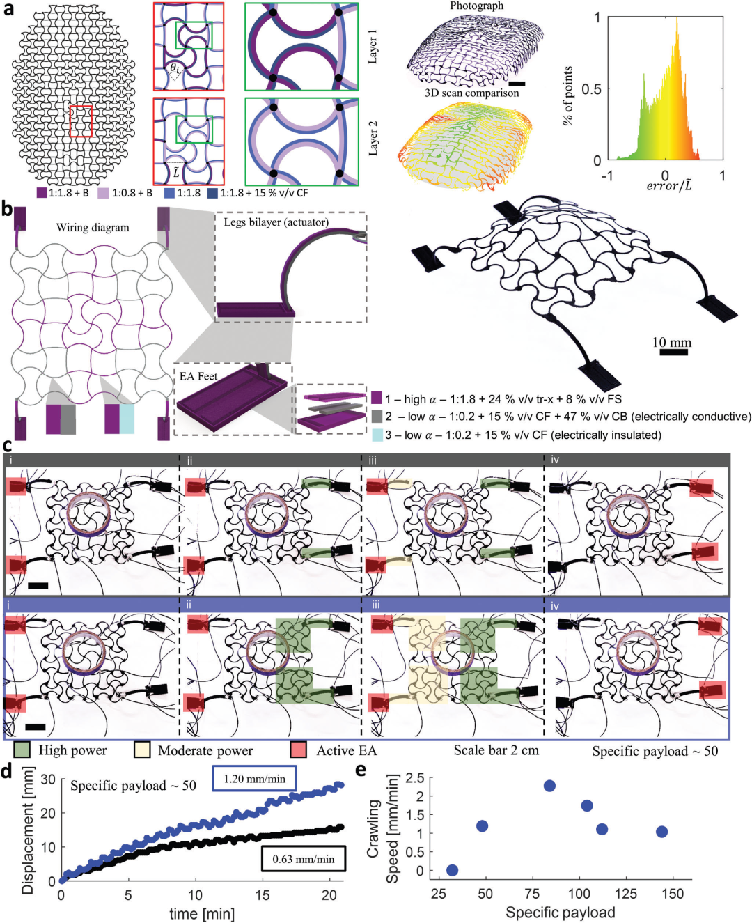 图5. 多功能3D晶格结构的集成设计和制造研究者开发了用于4D打印的新型非均质聚合物复合材料,具有高刚度、可调的热膨胀系数(α)和导电性(σ)。证明了这些材料的印刷双层表现出可编程和可预测的热响应和机械响应,在通过焦耳加热驱动时具有高应变系数自感测。这些材料能够制造一种具有高度可重复的自感测能力的新型刚性提升致动器,使得能够实现调制驱动的闭环控制,比负载能力高达其自身重量的885.90倍。与现有3D打印主动致动器相比,该机器人在致动应力和比质量上分别提高了150倍和3.55倍。此外,将机器人致动器的性能与3D打印的商用致动器进行比较,本研究的致动器是19种不同类型中性能第五高的致动器。表明这些材料可以与晶格结构的多材料4D打印相结合,以形成大的、刚性的和复杂的形状转换结构。将这些材料的多功能性与变形晶格方法相结合,研究者开发了一种具有多种爬行运动模式的刚性、电控形状移动机器人晶格。随着进一步发展,这些材料可用于新的复合材料结构设计,以开发更强大、自主的变形系统,如传感器、致动器、天线和机器人。文献链接: