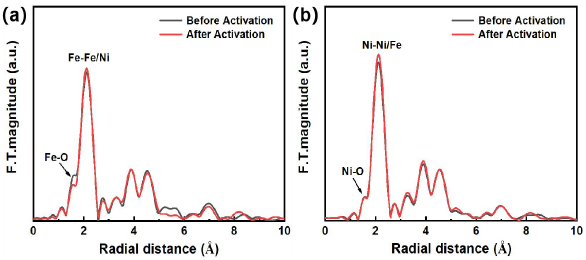 同步辐射强度高、覆盖的频谱范围广,可以对材料的电子结构进行精确分析,并帮助理解催化剂的反应机理。为分析材料在活化前后的结构变化,利用同步辐射对样品的体相结构进行了进一步的表征。如图9a所示,信号中具有很大成分的金属-金属键(位于2.11Å),但是并没有完全掩盖掉材料表面结构的Ni-O键和Fe-O键,分别位于1.56Å和1.57Å。对比活化前后的结构,发现活化后Fe-O键强度减弱,而图9b中的Ni-O键强度没有发生明显变化,表明活化后Fe-O键配位数有一定程度的降低。我们认为活化过程中,氧空位浓度的提高主要来自与Fe-O键附近的结构变化,即Fe位点周围更容易生成氧空位结构。另外,Fe和Ni的金属-金属键强度均有不同程度的提高。 图9. Ni k-edge 和Fe k-edge 的傅里叶变换-扩展x 射线吸收精细结构谱