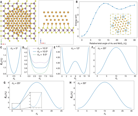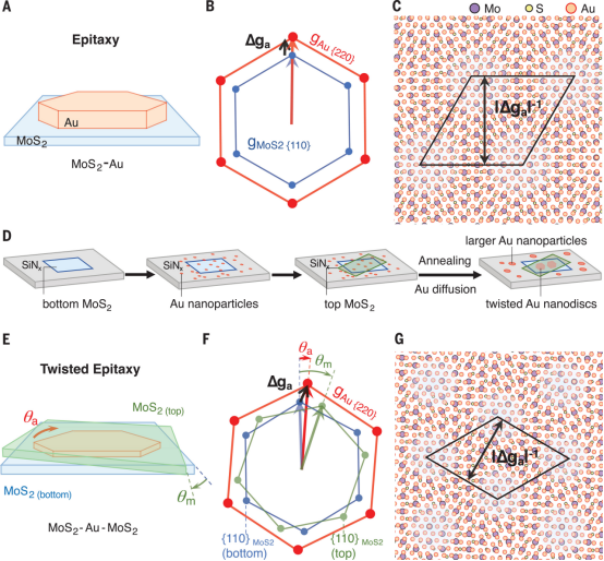 我们提议使用2D二硫化钼(MoS2)作为两个基底,金(Au)作为扭曲的外延层。Au与硫(S)原子之间的化学相互作用比传统的vdW相互作用强,但比共价键弱。这种配置不仅会稳定2D Au,还会调整其取向。先前对单晶MoS2上真空沉积Au的研究显示,面心立方(fcc)紧密堆积的Au平面与六方MoS2平面之间存在外延关系。