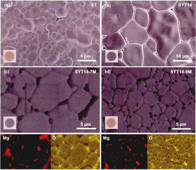 从图8中可以看出,Sb2Se3晶体由一些大的微米级晶粒组成。(Sn0.05Sb0.95)2Se3晶体经化学腐蚀后清楚显示出晶粒分布,且平均晶粒尺寸约为15μm。此外,通过 EDS元素分布图能观察到晶体中各元素的空间分布,其中Sb和Se在整个晶体中均匀分布,而掺杂元素Sn经化学腐蚀后在晶界处存在富集现象。对于Sn 掺杂浓度更高的(Sn0.10Sb0.90)2Se3晶体,化学腐蚀后Sn富集区更加明显,如图 8c 所示。图8d中点1取自图8b,点2则取自图 8c,两个点的原子比Sn:Sb:Se 分别为14.54:23.74:61.72和15.39:22.22:62.39。由此可知,不同化学组成的(SnxSb1-x)2Se3晶体得到的Sn富集区却呈现类似的元素组成,并且具体的原子比例接近于Sn2Sb4Se8对应的化学计量比,即2:4:8。