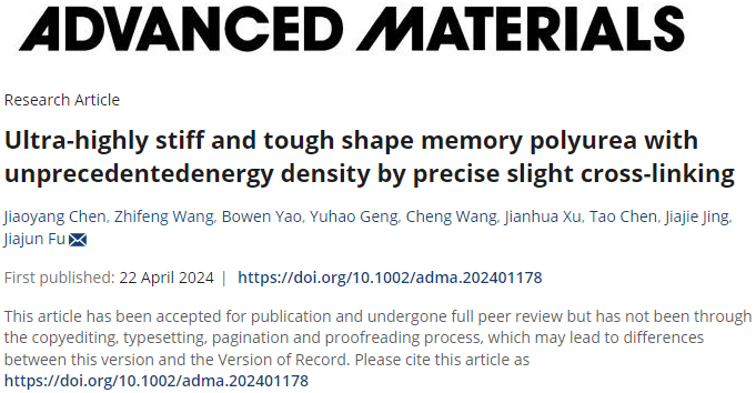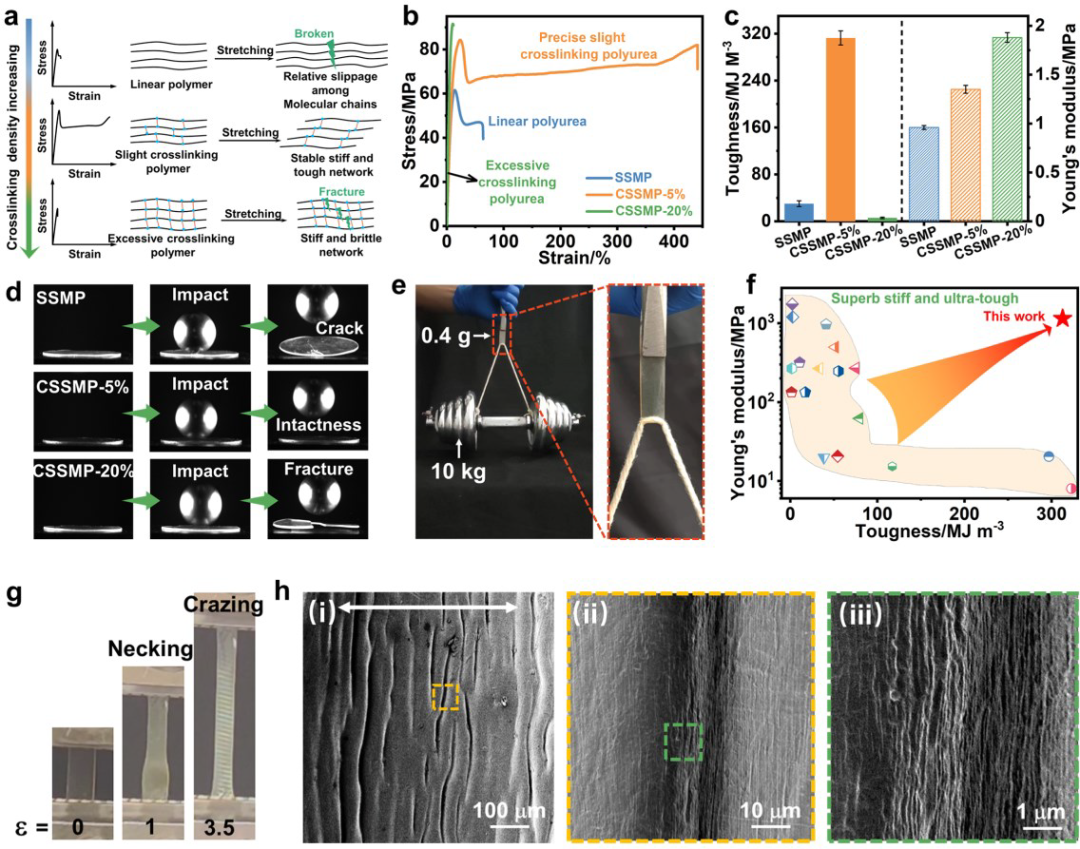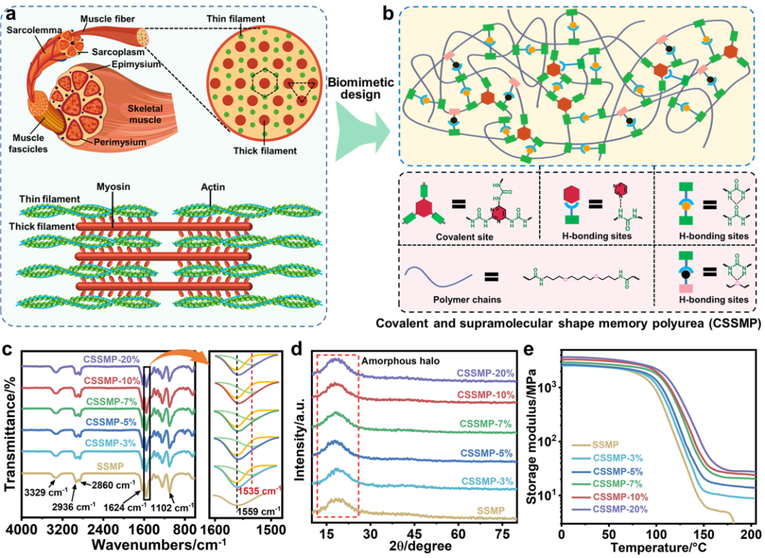 形状记忆聚合物(SMPs)可以在外部刺激下实现临时变形和原始形状之间的可逆转换,在航空航天工程、软机器人、智能纺织品、人工肌肉和生物医学设备中展现出出巨大的应用潜力。响应能力主要源于聚合物在不同温度下的相变行为,包括玻璃态/橡胶态、液晶态/非晶态、固态/液态等,其能量由先前通过机械变形/拉伸存储的聚合物熵的自发释放驱动。然而,实现SMPs的高能量密度(<1MJ·m-3)仍是其面临的一大挑战。高能量密度要求SMPs在强度、韧性、可恢复应力和可恢复应变之间达到微妙的平衡。然而,提高形状恢复能力通常会伴随着杨氏模量的降低,而增强能量释放能力又往往导致网络的高刚性和较低的形状记忆效果。例如,通过添加刚性填料,如碳纳米管(CNTs)和银纳米线(AgNWs),可以显著提高机械强度和变形恢复应力,但可恢复应变较低(<50%);在弹性体中引入固液相变材料可以延长断裂应变,但回收应力低,从而降低了熵能。为了改善这一问题,研究者们尝试构建动态绑定网络,通过能量耗散机制来提高SMPs的能量密度。其中动态键在拉伸过程中经历重复断裂和重组,从而保持恒定的交联密度。然而,目前的合成方法主要依赖于动态共价或非共价交联,其结合强度较低,导致超分子网络的恢复应力增长不令人满意。同时,SMPs的环境稳定性普遍较差,而基于动态共价键的SMPs则表现出较差的再加工性,这通常需要额外的催化剂。此外,为确保SMPs的长期可靠应用,对其可修复性的需求也日益凸显。因此,设计一种能够兼具优异的恢复应力、耐久性、环境稳定性、可修复性和可再加工性的SMPs仍然是一个巨大的挑战。近日,南京理工大学傅佳骏教授团队受肌肉纤维结构的启发,提出了一种新的分子工程策略,通过在超分子聚合物的分级氢键网络中精准引入轻微交联来制备高性能SMPs。基于这一策略,成功开发出聚脲基共价超分子形状记忆聚合物(CSSMP),表现出卓越的机械性能,包括高刚度(1347MPa)、强度(82.4MPa)和韧性(312.7MJ·m-3),从而适用于广泛的实际应用。并且,CSSMA还具有出色的可回收性和可修复性,以及优异的防潮、耐热和耐溶剂性。此外,该聚合物形状记忆效应显著,能量密度高达24.5MJ·m-3,由应变诱导的定向纳米结构的形成促进,可储存大量熵能。同时,它还保持了96%的形状固定性和99%的形状恢复性。这种共价键和超分子键的微妙相互作用为创造高性能SMPs很有前途的途径,进一步拓展了其在各领域的应用范围。相关研究工作以“Ultra-highly stiff and tough shape memory polyurea with unprecedented energy density by precise slight cross-linking”为题发表在国际顶级期刊《Advanced Materials》上。为了达到模仿肌肉纤维的目的,需要精心选择与设计聚合物网络的成分和微观结构。具体而言,通过一锅两步缩聚方法,将二异氰酸酯单体(IPDI)、通过分级氢键连接的非共价键二胺单体(BEA)和共价三胺单体合成了一系列坚固和坚硬的CSMP-x%(图1b)。为验证CSSMA的生成,采用了1H NMR、GPC和ATR-FTIR多种表征手段。FT-IR光谱(图1c)分析显示,所有CSSMP中-NCO基团峰完全消失,表明异氰酸酯和胺基团之间的反应转化率接近100%。此外,位于3329、1635和1098cm-1处的峰,分别对应-NH-、-C=O和-C-O-C。值得注意的是,在1600-1500cm-1之间的吸收振动范围内,1535cm-1处出现了一个新峰,归因于嘧啶环的C=N基团的拉伸振动。进一步通过XRD分析,CSSMP图中无结晶峰,从而证实了其无定形分子结构(图1d)。在热条件下,当线性SSMP变成粘性流体时,如储能模量急剧下降所示,CSMP变成橡胶状,其储能模量几乎保持不变,证实了结构完整性在高温下保持不变(图1e)。