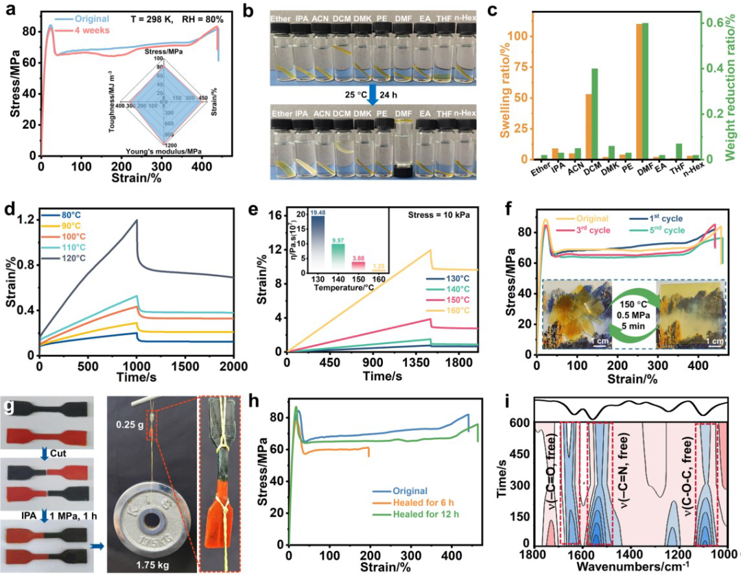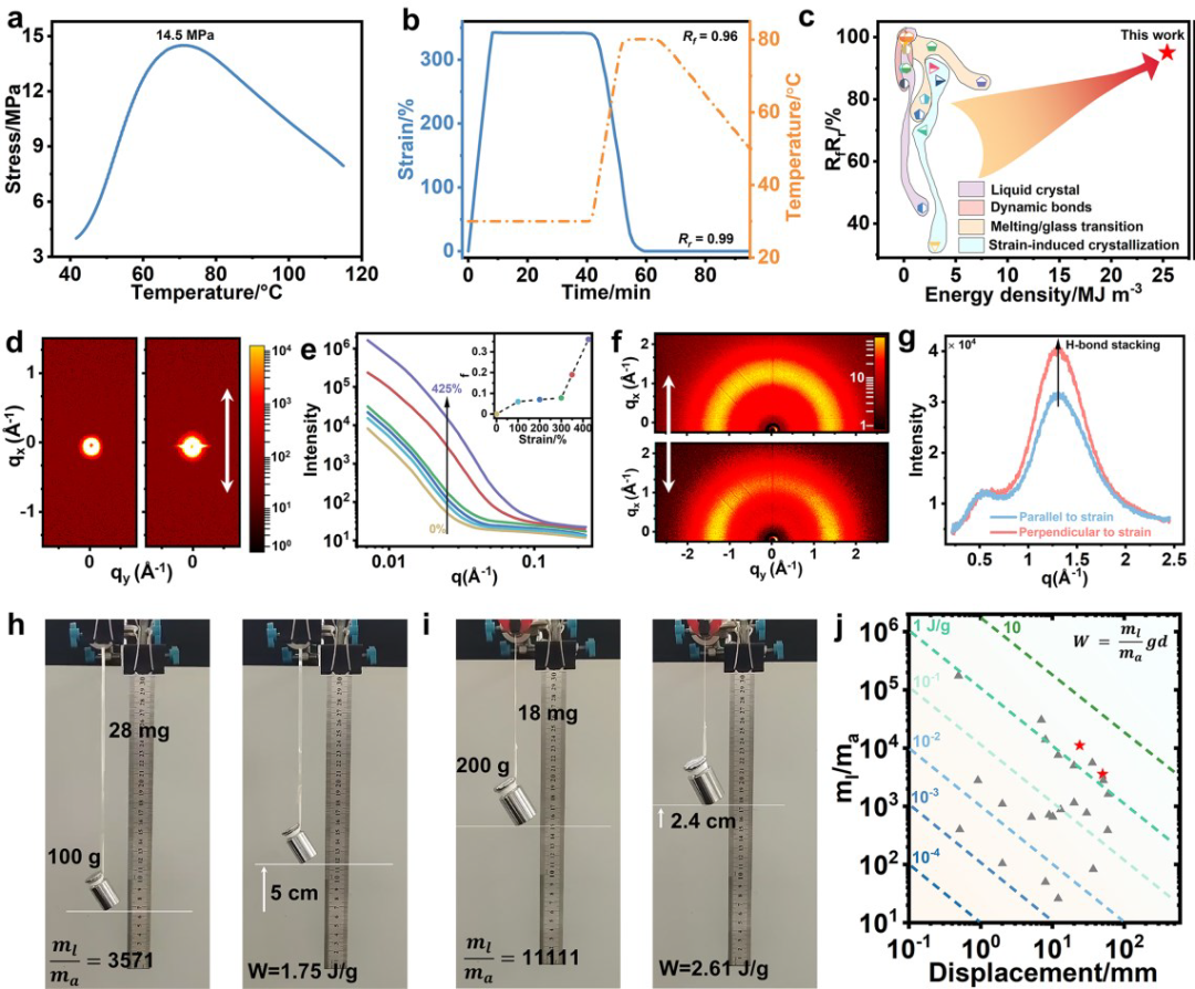 将永久共价交联引入到动态网络以形成双交联网络,已被证实为提升机械性能的有效策略。通过精确控制交联密度,不仅赋予材料高强度,还显著提升了其断裂伸长率和韧性(图2a)。为了探索交联密度对机械性能的影响,进行了一系列拉伸试验。图2b显示,随着交联点密度的增加,样品的杨氏模量也相应提升。SSMP、CSMP-5%和CSMP-20%的杨氏模量分别为960±12、1347±21和1876±27MPa(图2c)。除了CSMP-20%的脆硬性能和SSMP的伸长率不令人满意外,CSMP-5%的伸长率和韧性分别为440.6±21%和312.7±12MJ·m-3。在拉伸试验后,只有CSSP-5%的材料保持了整体块状结构的完整性,而CSSP-20%的材料则粉碎成许多小块,SSMP也出现了可见的裂纹(图2d)。在这些样品中,CSSMP-5%由于其适当的交联点密度,表现出更全面的性能。特别是,CSMP-5%的薄带能够轻松提起重达其25000倍的重物(图2e)。就杨氏模量和韧性而言,CSMP-5%远优于近期文献报道的其他SMPs(图2f)。CSMP-5%的优异性能可归因于共价键和超分子键的协同作用。用SEM研究了拉伸后的CSSP-5%薄膜表面,发现裂缝由宽度约为10μm的微裂缝组成,,每个微裂缝又由纳米级的沟裂缝排列而成。这种微观结构有效地分散了施加的应变能,防止了显著裂纹的形成,并有助于获得高延展性和卓越的韧性(图2h)。图2. 应力-应变曲线和应变下聚合物分子尺寸的变化(a);应力-应变曲线(b);韧性和杨氏模量(c);受到50g钢球冲击的光学图像(d);光学图像(e);杨氏模量和韧性的比较(f);当进行单轴拉伸试验时,不同应变下CSSMP-5%的光学图像(g);拉伸CSMP-5%膜的表面的SEM图像(h)如图3a所示,3329cm-1处的拉伸振动带属于尿素单元的-NH基团。当温度从30°C加热到160°C时,该波段出现明显的蓝移,同时强度显著降低。同时,1631、1558和1104cm-1处的氢键-C=O、-C=N和-C-O-C的伸缩振动带也随着峰宽的变窄而发生蓝移,加热后振动带强度逐渐降低。相应地,自由-NH、-C=O、-C=N和-C-O-C的拉伸振动带逐渐增强,揭示了相关基团的不同氢键断裂,进而产生自由氢键(图3a-C)。这些结果表明,在分子尺度上,CSMP-5%网络中存在多个氢键,它们在拉伸过程中的能量耗散中起到了关键作用。此外,还进行了二维相关光谱(2D-COS)FTIR光谱,以研究CSMP-5%中分级氢键的精确类型(图3d-g)。结果显示,Φ(3329, 1624)、Φ(3329,1535)、Φ(3329,1102)处三个相关交叉峰,归属于脲-脲、脲嘧啶和脲醚产生的氢键。这在同步光谱中清晰可见,而在异步光谱中消失,证实了聚合物链中存在不同类型的分子间氢键。除了氢键类型的变化外,量子化学计算还揭示了三种类型氢键之间不同的结合能,其顺序为:脲-脲(14.432kcal·mol-1)>脲醚(11.287kcal·mol-1)>脲嘧啶(7.216kcal·mol-1)(图3h)。这种分级表示存在不同强度的氢键,并形成分级网络。较弱的键在断裂后迅速重新配置,有助于耗散应变能,而较强的键有利于构建强大的分子网络。图3. 依赖于温度的FTIR光谱(a-c);同步(d, f)和异步(e, g) 2D相关FTIR光谱;三种类型的单个氢键的结合能(h);SSMP链的MD模拟快照(i-k);界面剪切力作为拉位移的函数(l-n)与线性SSMP相比,精确化学交联的引入使CSSMP-5%的抗外部刺激能力显著增强。首先,CSSMP-5%表现出非凡的耐湿性,即便在高湿度环境(RH=80%)中暴露4周后,其稳定性和机械性能保持不变(图4a)。CSMP-5%在DMF、DCM和IPA中表现出不溶性,并且在其他溶剂中保持不卷曲(图4b)。这种极低的可溶性组分占比(<0.6%),突出了其在有机溶剂中的高化学稳定性,这归因于坚固的交联网络结构(图4c)。不仅如此,CSMP-5%还表现出非凡的耐高温蠕变性能,使其适合在高温下长期运行。如图4d所示,当在120°C以下的温度下承受1MPa的恒定载荷超过1000s时,CSSMP-5%的蠕变应变几乎可以忽略不计。相比之下,SSMP在110°C和120°C下的蠕变应变分别高达11.2%和20.3%,分别是CSSP-5%的14.7和16.9倍,突出了稳定化学交联所赋予的优越的高温蠕变耐受性。通过蠕变恢复和应力松弛实验评估了CSMP-5%的可加工性。当温度范围为130至160°C时,CSMP-5%的粘度显著且连续降低,从19.48×107降至1.25×107Pa,同时计算的表观活化能(Ea)为112.8kJ·mol-1(图4e)。这一观察结果明确表明,引入少量化学交联并不会增加后处理的复杂性。此外,由于氢键的可逆性,完整的CSMP-5%体积在0.5MPa下,在150°C的中等温度下,通过热压5min,仅需5分钟即可实现反复冲切和再处理(图4f)。为了评估可回收性的稳定性,进行了五次重复回收过程,随后使用拉伸测试、ATR-FTIR、DSC和DMA评估回收样品。回收样品的拉伸试验结果显示,即使在第五次回收后,样品的强度和韧性也没有显著下降(图4f)。图4. 拉伸应力-应变曲线(a);光学图像(b);溶胀率和重量减少率(c);蠕变恢复曲线(d,e);拉伸应力-应变曲线(f);修复彩色CSMP-5%的图像(g);应力-应变曲线(h);PCMW2D同步光谱(i)图5a、5b显示,CSMP-5%表现出显著的最大恢复应力(σr, max)为14.5±0.2MPa和最大可恢复应变(εr, max)为350%。这相当于估计的体积能量密度(E=1/2σr, maxεr, max)为25.4±0.7MJ·m-3。此外,CSMP-5%分别表现出0.96的形状固定性(Rf)和0.99的形状恢复性(Rr)(图5b),使其能够以最小的滞后经历多个形状记忆循环。如图5c所示,CSMP-5%结合了高延展性和显著恢复应力,其能量密度远超先前报道的SMPs。这种增强的能量密度可能源于应变诱导的纳米结构的形成,从而允许额外熵能量的存储。图5d为二维透射小角度X射线散射(SAXS)成像分析,应变膜表现出显著增加的强度和显著的各向异性散射图案。散射强度沿拉伸方向变化,表明生成