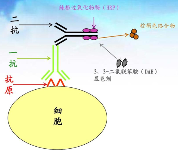 根据抗原抗体反应和化学显色原理,组织切片或细胞标本中的抗原先和一抗结合,再利用一抗与标记生物素、荧光素等的二抗进行反应,前者再用标记辣根过氧化物酶(HRP)或碱性磷酸酶(ALP或AKP)等的抗生物素(如链霉亲和素等)结合,最后通过呈色反应或荧光来显示细胞或组织中化学成分,在光学显微镜或荧光显微镜下可清晰看见细胞内发生的抗原抗体反应产物,从而能够在细胞爬片或组织切片上原位确定某些化学成分的分布和含量。