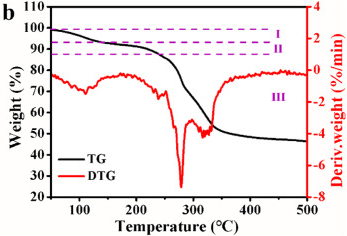 通过热重分析(TG)对HOF-21纳米粒子的热稳定性进行了表征。如图5所示,TG曲线显示HOF-21在0-500°C范围内主要有三个失重阶段。第一阶段的失重发生在50-130°C之间,质量损失约为5%,主要是由于高温下HOF-21孔隙中水和乙腈等溶剂分子的挥发和去除。在第二阶段,失重发生在130-230°C之间,质量损失约3.9%,这是由于HOF-21结构中与Cu2+配位的两个水分子的去除。第三阶段的失重发生在230°C以上,主要是由于HOF-21中腺嘌呤的分解。