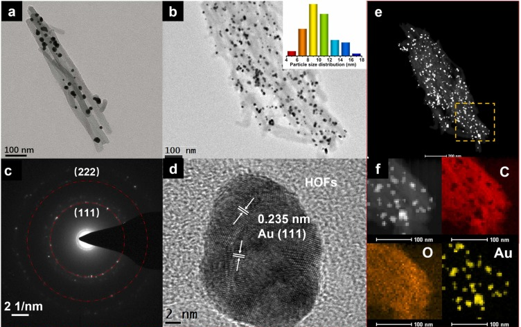 图2.(a)HOFs@Au的TEM图像;(b)HOFs@Au的HRTEM图像以及Au NP的统计直径分布;(c)HOFs@Au的SAED图片;(d)HOFs@Au的HRTEM图像;(e)HOFs@Au的HAADF-STEM图像;(f)HOFs@Au中C、O和Au的EDX图像