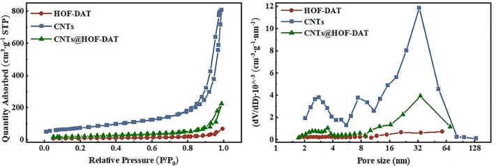 图6. CNTs、HOF-DAT和CNTs@HOF-DAT材料的N2吸附-解吸等温线(c)和孔径分布(d)