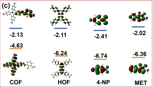 图10. ETTA-DFP COF、TCBP-HOF、4-NP和MET分子的LUMO和HOMO能级