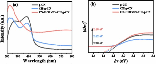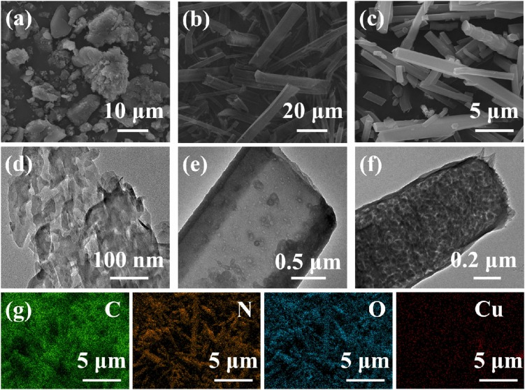 通过SEM和TEM对g-CN、CH-g-CN和CN-HOF/Cu/CH-g-CN的形态和微观结构进行了分析。图1a 显示,g-CN显示出不规则的块状结构。加入烟酸并煅烧后,CH-g-CN呈现出规则的中空棒状结构(图1b)。添加Cu后,CN-HOF/Cu/CH-g-CN在很大程度上保留了CH-g-CN的基本形态,但材料表面有明显的触手状结构(图1c)。这种独特的微观形态不仅丰富了材料的表面特性,而且有提高了目标污染物的接触和吸附能力,从而增强了光芬顿活性。