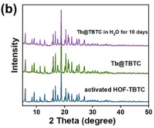 图3. 活化HOF-TBTC、Tb@TBTC及Tb@TBTC在H2O中浸泡10天的XRD图