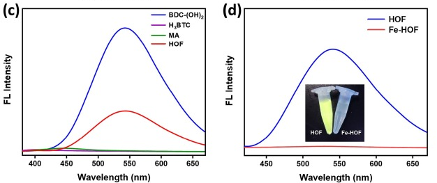图9.(c)MA(0.3mg/mL)、H3BTC(0.3mg/mL)、BDC-(OH)2(0.0025mg/mL)和HOF(0.005mg/mL)的荧光光谱;(d)HOF(0.3mg/mL)、Fe-HOF(0.3mg/mL)的荧光光谱