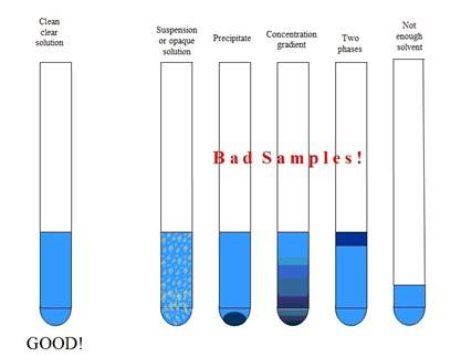 如下图所示,不能出现悬浮、沉淀、浓度梯度、两相或多相分层以及溶剂过多或过少等,常规溶液量在0.6ml左右最佳;