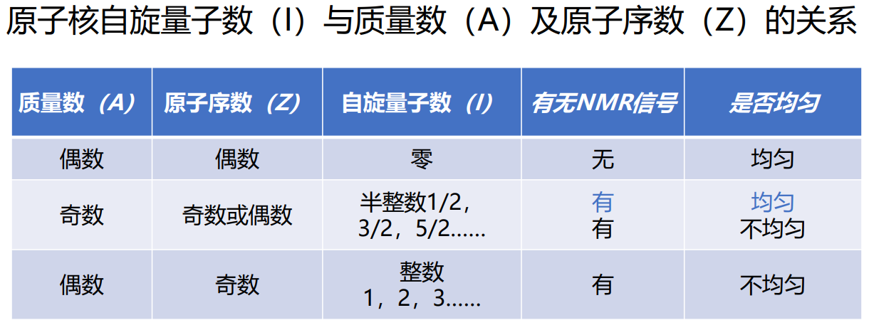 自旋量子数I≠0的核都有磁性,其中自旋量子数为半整数(I=1/2)时,电子云密度均匀,适合用于核磁检测。