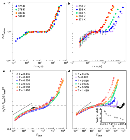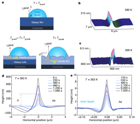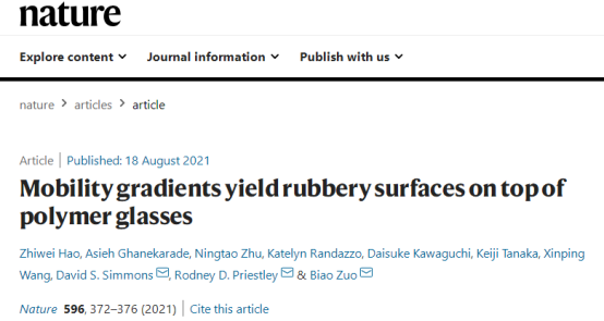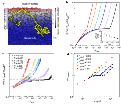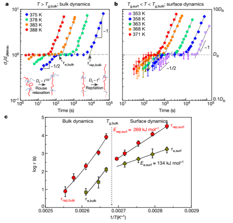 20世纪90年代初发现,相对于相应的主体材料,限制和表面接近导致分子和聚合物玻璃形成体的玻璃化转变温度(Tg)有很大的偏差,这一发现推动了广泛的研究。我们现在知道,许多玻璃的表面不是玻璃态,而是高度可移动的液体层,厚度通常在10纳米左右。这种增强分子迁移率的区域,对应于Tg的平滑指数梯度,解释了为什么超薄薄膜表现出Tg和其他重要特性,如粘度、物理老化、扩散、热膨胀,和结晶,这些特性与其体积值不同。这种具有增强的流动性的表面层还能够形成超稳定的玻璃态,并说明了对玻璃材料的冷连接和低温加工至关重要的摩擦和粘合性能。 就聚合物而言,分子运动发生在多个分子长度尺度上:单个聚合物链段的运动导致整条链的劳斯松弛,直至其拓扑缠结的长度尺度;在这个范围之外,扩散是由蛇形往复运动介导的。因为这些最长的长度尺度可以与表面移动区域的范围相当或更大,所以对于“长链聚合物是否可能进行表面扩散”仍然存在不确定性。此外,因为即使是整体动态不均匀性也可能破坏经典整体粘弹性理论在这些链模式中预测的热流变学简单性,所以界面如何改变聚合物链运动的温度依赖性也存在不确定性。 研究成果 许多新兴材料,如用于电话显示屏和有机发光二极管电视屏幕的超稳定玻璃,其性能归功于玻璃形成液体表面的增强的流动性梯度。这种表面流动性增强的发现重塑了我们对玻璃成型器的行为以及如何将它们成型为改进材料的理解。在聚合物玻璃中,由于存在第二个长度尺度(聚合物链的尺寸)以及界面迁移率梯度的长度尺度,这些界面改性变得复杂。今日,浙江理工大学左彪教授课题组等研究人员展示了模拟、理论和时间分辨表面纳米蠕变实验,以揭示玻璃态聚合物表面的这种双尺度性质驱动了短暂的橡胶状、纠缠状表面行为的出现,即使在由短的、亚缠结链组成的聚合物中也是如此。作者发现,这种效应来自片段动力学和链构象统计中的叠加梯度。随着材料的冷却,这种橡胶行为的寿命延长,这将对限制聚合物玻璃的摩擦学、粘附和表面愈合等应用的中心表面松弛产生广泛的影响。表面层在时间-温度叠加(TTS)中受到普遍破坏,这是聚合物物理和流变学的基本原理。这一发现可能需要重新评估预测高界面面积聚合物玻璃长期性能的策略。作者预计,这种界面瞬态弹性体效应和TTS击穿通常应该发生在从纳米复合材料到薄膜的大分子系统中,在这些系统中,界面决定了材料的性能。相关研究工作以“Mobility gradients yield rubbery surfaces on top of polymer glasses”为题发表在国际顶级期刊《Nature》上。据了解这是浙江理工大学首次以第一作者单位发表Nature,通讯作者为左彪特聘教授,祝贺! 这里介绍一下左彪教授,博士,硕士生导师,从事高分子材料表/界面、纳米受限聚合物聚集态结构及分子动力学相关高分子物理基础研究;发展聚合物材料表界面和纳米薄膜分子动力学的表征方法、揭示表/界面和受限聚合物结构、动力学和物理性质变化的机理和机制,发展高分子纳米复合材料、聚合物超薄膜等纳米高分子体系性能调控的新理论和方法。在 Nature, Phys. Rev. Lett.、ACS Nano、J. Phys. Chem. Lett.、Macromolecules、ACS Macro Lett. 等高分子领域重要学术期刊上发表学术论文 50 多篇。主持国家自然科学基金面上项目、国际交流项目各一项,主持完成国家自然科学青年基金一项。获第四届王善元优秀博士学位论文奖励,授权中国发明专利三项;入选浙江省高校领军人才培养计划、省院士结对培养青年英才计划和浙江理工大学青年拔尖人才计划。 图文速递 图1. 润湿脊的形成及其拓扑轮廓 图2. 聚合物纳米流变学和表面链动力学 作者用1-乙基-3-甲基咪唑四氟硼酸盐([EIm]BF4)液滴在聚苯乙烯薄膜上进行实验。这种配对提供了良好的稳定性,并避免了膨胀或塑化效应。首先关注分子量(Mw)为52 kg mol–1的缠结聚苯乙烯,这大约是聚苯乙烯(13 kg mol–1)缠结分子量(Me)的四倍—多分散指数为1.06,Tg (Tg,bulk)等于374 K。聚苯乙烯链的无扰动回转半径Rg约为6.2 nm,因此可与增强表面动态梯度的长度标度相比较,因此,预计表面上的每个聚合物链将在表面梯度内取样一系列局部界面动力学。 图3玻璃态聚合物表面TTS的破坏 图4在未缠结的聚合物表面出现橡胶动力学 通过在可比温度范围内对未缠结的聚合物膜进行分子动力学模拟来测试该理论的预测。如图4c所示,模拟与理论非常一致:该理论预测了随着体弛豫时间增加和温度降低而观察到的表面橡胶态的出现,最低模拟温度下的平台宽度几乎是定量预测的。该理论还预测(图4b插图)在模拟中看到的冷却时表面橡胶响应的硬化(图3d插图),由表面动态梯度的增加幅度驱动。图4d证实了橡胶平台在低温下出现在亚缠结聚合物的表面,与理论和模拟定性一致。 结论与展望 显然,长链和短链聚合物都可以在聚合物玻璃表面扩散,但它们的扩散是通过与梯度更深处的较慢松弛材料的连接来控制的,即使在亚缠结系统中也产生短暂的橡胶状表面行为。因此,这种缓慢、短暂的橡胶状表面链动力学新模式的出现,正是因为表面链段动力学相对于整体而言被加速了。 文章链接: