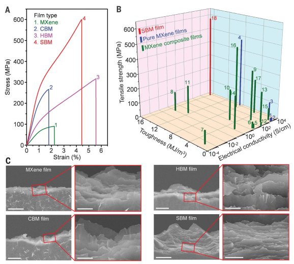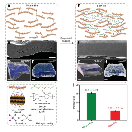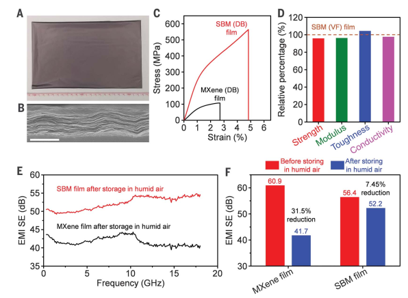 图4.采用DB浇注法制备的大面积SBM膜的性能和在潮湿空气中储存的SBM膜的电磁屏蔽性能