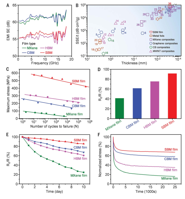 图3.SBM薄膜的电磁干扰屏蔽性能和抗疲劳、氧化和应力松弛性能