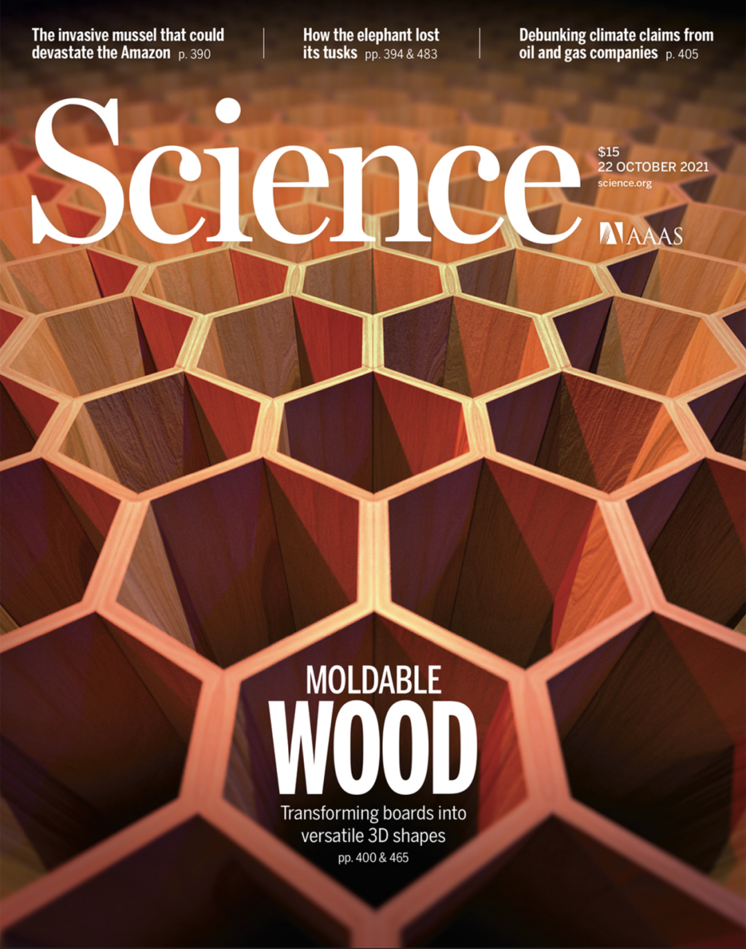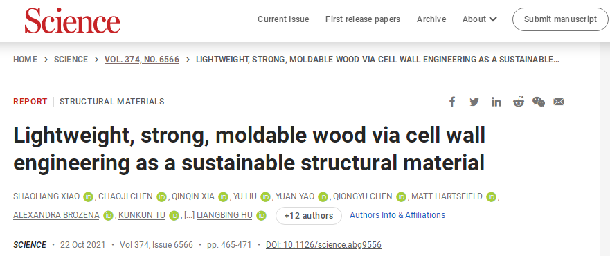 木材是一种可持续的结构材料,但它不能在保持其机械性能的同时轻松成型。近日,马里兰大学胡良兵教授课题组报道了一种加工策略,该策略使用细胞壁工程将硬木平板成形为通用的三维(3D)结构。在分解了木材的木质素成分并通过蒸发水分封闭了导管和纤维之后,作者在快速的水冲击过程中部分地使木材重新膨胀,从而选择性地打开导管。这形成了独特的褶皱细胞壁结构,允许材料被折叠和成型为所需的形状。最终的3D模制木材比原始木材强六倍,可与铝合金等广泛使用的轻质材料相媲美。这种方法扩大了木材作为结构材料的潜力,对建筑和运输应用的环境影响较小。相关研究工作以“Lightweight, strong, moldable wood via cell wall engineering as a sustainable structural material”为题发表在国际顶级期刊《Science》上,并作为封面!
