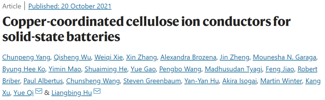 更加令人赞叹的是,就在前一日,胡良兵教授和布朗大学齐月教授等人在Nature上发表了题为“Copper-coordinated cellulose ion conductors for solid-state batteries”的重磅成果,报告了通过分子通道工程实现高性能固体聚合物离子导体的一般策略。该策略基于扩展分子间聚合物结构和将Li+传输与聚合物链段松弛解耦,从而导致高离子导电性。两天内连发Nature、Science,太厉害了!
