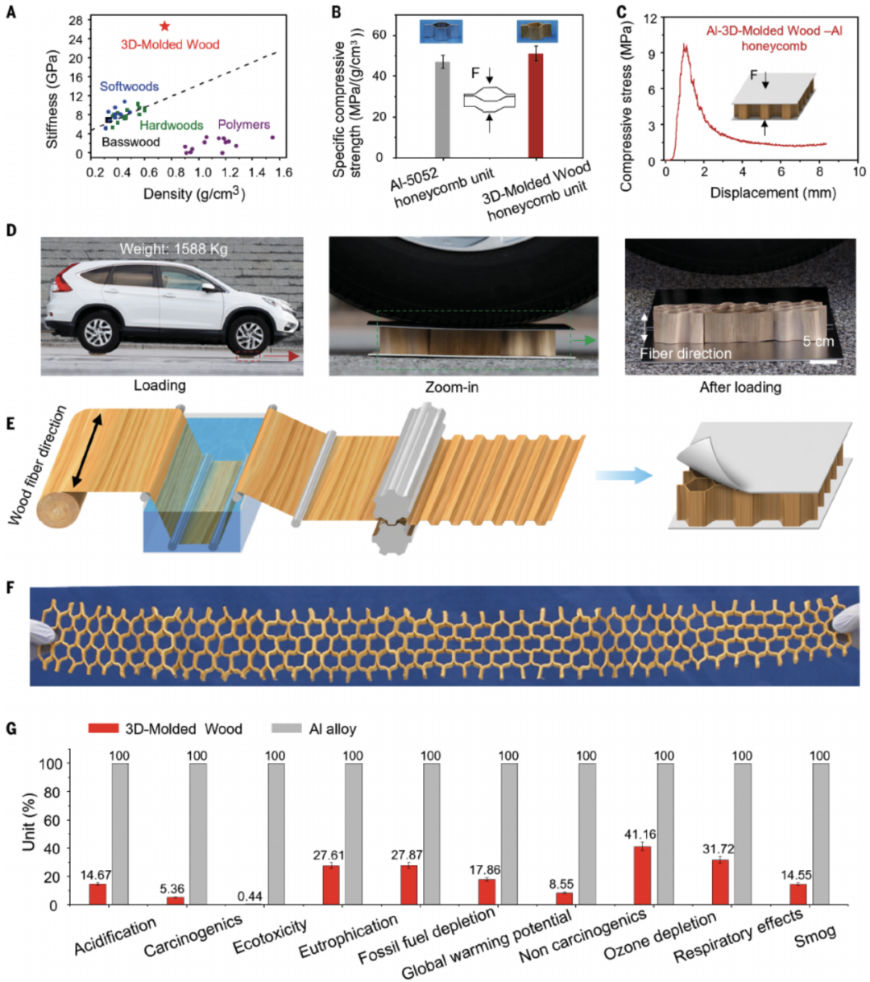 这种细胞壁工程工艺保持了固有的各向异性木材结构,并增强了木材纤维之间的相互作用,以进一步提高机械强度。例如,作者展示了用木质单板(使用卷对卷旋转切割生产)制造蜂窝芯材,其拉伸强度约为300兆帕,类似于铝合金,但密度仅为约0.75克/立方厘米,成本可能更低(图1、B和C)。这种细胞壁工程方法适用于各种硬木物种,并通过水冲击过程实现,该过程将木材作为轻质结构材料的能力从传统的平面结构扩展到具有更大多功能性的复杂三维设计和组件。操纵木材的各向异性结构将提高其作为传统上仅限于聚合物、金属和聚合物复合材料的可持续和实用替代品的潜力(图1C)。