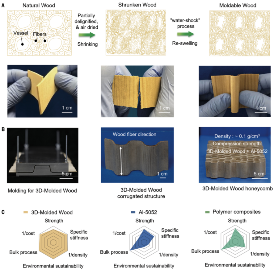 木材是替代这些轻质结构材料的潜在候选材料之一,特别是考虑到其作为可再生资源的优势。木制品可以通过替代碳密集型化石燃料材料以及提供长期碳储存来帮助缓解气候变化。木材机械强度高,重量轻,潜在成本低。已经证明了各种方法可以改善木材的性能和功能,以用于更广泛的应用,包括脱木素、致密化和其他改性如热处理、有机或无机盐浸渍等。也就是说,与金属和塑料相比,它的成形性通常较差,这使得将它加工成复杂的形状变得困难。