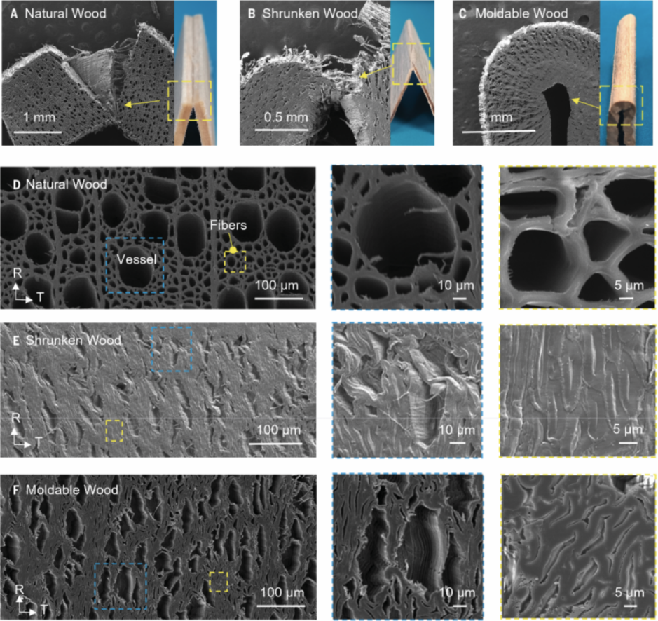 图2. 天然木材、皱缩木材和可塑木材的微观结构