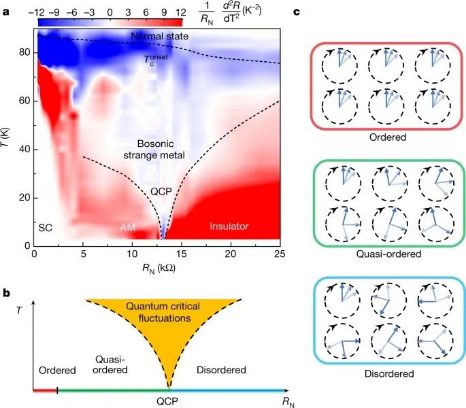 目前的工作揭示了一种独特的低温玻色子金属输运行为,它不同于先前超导体-绝缘体转变的玻色子局域化范式,在该范式中,金属行为在类似调谐参数的磁场或正常态电阻的临界点出现临界电阻RQ。类似于反常金属状态,这种奇怪的金属状态存在于一系列调谐参数中,剩余电阻远低于RQ。区分这种玻色子输运行为的主要特征是:(1)电阻随温度线性变化,其斜率类似于电阻量子与表征电荷载流子基态的能量标度之比;(2)如图3中的数据崩溃所暗示的随磁场线性变化的磁阻;以及(3)这些行为在扇形区域中的出现,该扇形区域似乎终止于图4中相图中的量子临界点。四、结论与展望