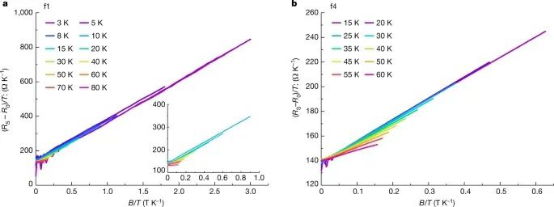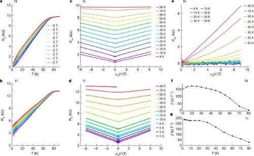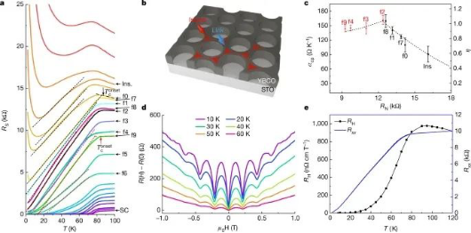 图1. 纳米图案YBCO薄膜中金属绝缘体玻色子异常跃迁附近的温度线性电阻图2. 垂直磁场下纳米图案YBCO薄膜的T线性电阻和尺度不变B线性电阻在这里,作者打破现有的模式,即奇怪的金属状态是费米子系统的专有,研究表明这种不寻常的线性在玻色子宿主中会出现抗性行为。在库珀对形成的温度以下,纳米图案化的YBCO薄膜表现出T线性电阻、h/2e磁阻振荡和零霍尔系数RH,表明当前系统是一种奇特的金属,玻色子主导其输运。在超导体-异常金属转变的量子临界区附近,当前YBCO奇异金属的T-线性电阻αcp的斜率与h/2e2×1/TConset(TConset,库珀对形成的起始温度)相当。这类似于费米子体系的αF≈h/2e2×1/TF。此外,磁电阻呈线性,斜率βcp近似于h/2e2×1/B*(B*为特征磁场)。有趣的是,斜率之比αcp/βcp似乎仅由基本常数2μB/kB决定,这表明缺乏系统的内在能量尺度,因此缺乏尺度不变行为。这项研究扩展了奇异金属态的可能量子空间,并推进了对基础物理的理论理解。目前的研究是在一系列高温超导YBCO薄膜上进行的,这些薄膜是由原始YBCO薄膜通过反应离子刻蚀(RIE)通过具有三角形孔阵列的纳米多孔掩模形成图案的。纳米图案化使这些样品具有由弱连接连接的六边形超导“岛”阵列(图1b)。增加刻蚀剂量可以通过在孔中诱导更多的侧壁损伤来增加正常状态电阻RN,从而使阵列节点之间的链接更具电阻性。