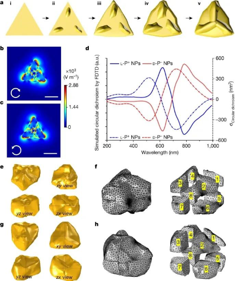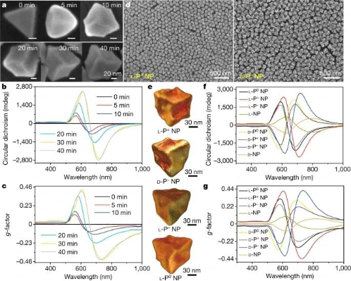仿生纳米粒子表现出分子和纳米尺度的手性,对应于表面配体和纳米粒子整体的几何形状。手性的两个尺度都可以在细胞信号网络的激活中发挥作用,作者在这里工作的一个基本任务是区分它们的生物效应。然而,因为手性纳米粒子的典型合成涉及耦合的分子和纳米尺度的手性,所以很难明确地将生物效应指定给其中一个。为了解决这个问题,作者通过用圆偏振光(CPL)或线偏振光照射种子粒子来制备金纳米粒子对映体。纳米粒子不对称的程度可以通过改变照明参数来改变同时保持化学参数不变。作者使用金纳米棱镜和其他非手性形状的纳米粒子,由非手性配体稳定,作为种子。在不同二肽存在下,在氯化聚乙烯下合成的纳米粒子在本文中被称为L/D-PX纳米粒子。这里,L/D表示L/D-二肽的手性。x可以是+,或0,表示纳米粒子合成中使用的光子的偏振:+和-分别表示左圆偏振光(LCP)和右圆偏振光(RCP)的照明条件,导致P+纳米粒子和P纳米粒子,而0表示线偏振光下的合成。照射后得到的纳米颗粒与原来的非球形纳米颗粒保持了一些相似性,但获得了类似螺旋桨叶片的面外突起,导致了强烈的几何和光学不对称性。