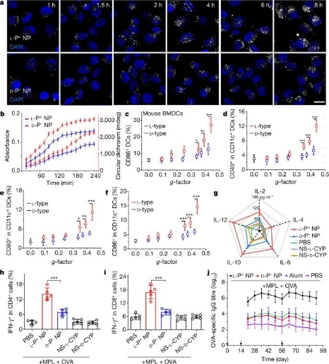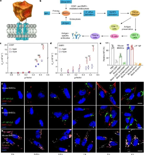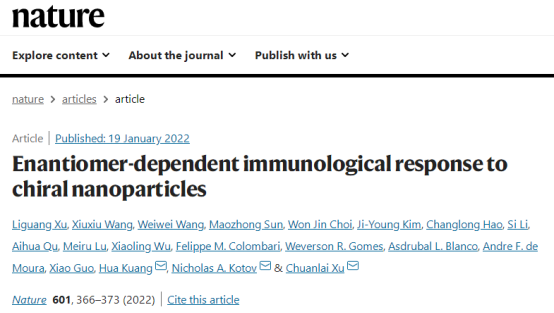 手性是生物和非生物形式物质的一种统一的结构度量。在过去的十年中,在手性无机纳米粒子的化学和物理理解方面已经取得了相当大的进展;然而,关于它们对复杂生化网络的影响,人们所知甚少。生物分子和无机纳米粒子的分子间相互作用显示出一些共性,但是这些结构在尺度、几何形状和手性形状的动力学方面有所不同,这可以阻碍也能加强它们的镜像不对称复合物。近日,江南大学胥传来教授、匡华教授和美国密歇根大学Nicholas A. Kotov教授等研究人员报道非手性和左旋和右旋金仿生纳米粒子显示出不同的体外和体内免疫反应。作者利用圆偏振光(CPL)的照射来合成具有可控纳米尺度手性和光学各向异性因子(g因子)高达0.4的纳米粒子。研究发现,纳米颗粒与粘附G蛋白偶联受体(AGPCRs)家族中的两种蛋白质——即分化簇97 (CD97)和表皮生长因子样模块受体1(EMR 1)——的结合导致机械敏感钾流出通道的开放、炎性细胞免疫信号复合物的产生以及小鼠骨髓来源的树突状细胞的成熟。体内和体外免疫反应都单调依赖于纳米颗粒的g因子,这表明纳米尺度的手性可以用来调节免疫细胞的成熟。最后,左手性纳米粒子作为接种H9N2流感病毒疫苗的佐剂,显示出比右手性纳米粒子高得多(1258倍)的效率,为在免疫学中使用纳米尺度手性开辟了一条道路。相关研究工作以“Enantiomer-dependent immunological response to chiral nanoparticles”为题发表在国际顶级期刊《Nature》上。江南大学徐丽广教授和2018级博士生王秀秀为该文章的共同第一作者。据报道这是江南大学首次以第一单位发表Nature,这也是江南大学科研实力的体现,祝贺!胥传来,博士,国务院政府特殊津贴专家;中组部科技创新领军人才;科技部重点领域“食品安全”创新团队负责人;江苏省“333工程”第一层次中青年首席科学家;国家科技进步二等奖4次(2007,2/10;2009,3/10;2011,2/10;2017,1/10);第二十二届中国专利银奖;英国皇家化学会RSC Fellow;RSC Advances, Associate Editor;Food and Agricultural Immunology, Editor in Chief.。图文速递