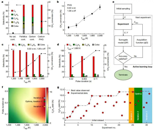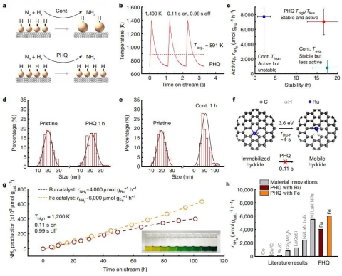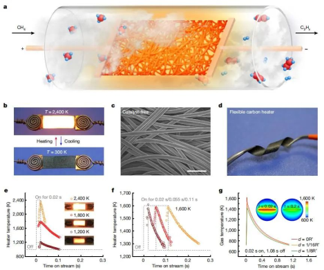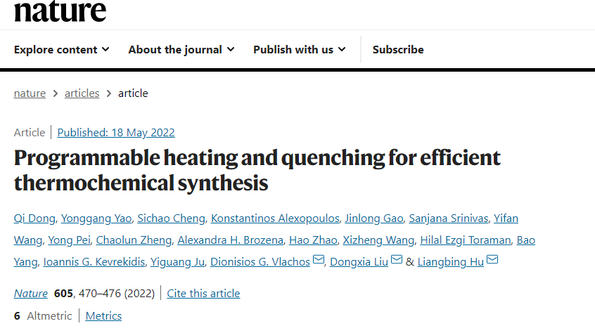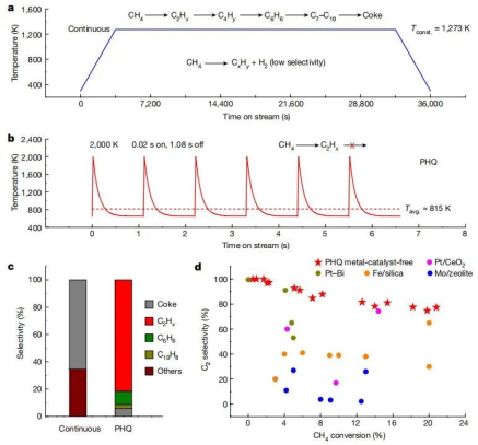 热化学反应沿着受反应温度和时间严重影响的特定路径进行。特别是,根据阿伦尼乌斯定律,基元反应速率与温度呈指数关系,通过建立或改变化学平衡可进一步影响产物分布。因此,加热曲线的动态调节可用于控制目标产物产率和选择性的反应途径。然而,传统的热化学反应通常是在接近平衡的条件下连续加热进行的,尽管长期以来一直致力于开发动态加热反应器。这部分是因为传统的加热装置表现出差的热传递和大热惯性,这使得对温度分布进行瞬时控制具有挑战性,从而影响反应路径。以甲烷(CH4)热解为例,CH4选择性转化为增值产品已被证明极其重要,但在相对温和的温度范围(< 1400 K)下连续加热很难实现。化学平衡的限制常常导致有限的选择性、低转化率或两者兼有。 在接近平衡的条件下,通过连续加热进行的常规热化学合成在提高合成速率、选择性、催化剂稳定性和能源效率方面面临着严峻的挑战,因为缺乏对反应温度和时间以及反应途径的时间控制。作为一种替代方案,今日,马里兰大学胡良兵、刘冬霞等研究者提出了一种非平衡连续合成技术,该技术使用脉冲加热和淬火(例如,0.02 s开,1.08 s关),使用可编程电流在高温(例如,高达2400 K)和低温之间快速切换反应。快速骤冷确保了高选择性和良好的催化剂稳定性,并降低了平均温度以降低能量成本。使用CH4热解作为模型反应,这项可编程加热和急冷技术导致对增值C2产品的高选择性(超过75%,而传统非催化方法< 35%,使用优化催化剂的大多数传统方法< 60%)。该技术可以扩展到一系列热化学反应,例如NH3合成,作者在环境压力下使用非优化催化剂在100小时以上实现了约6000 μmol gFe-1h-1的稳定和高合成速率。该研究为高效非平衡热化学合成建立了新的模式。相关研究工作以“Programmable heating and quenching for efficient thermochemical synthesis”为题发表在国际顶级期刊《Nature》上。据报道,胡良兵教授在四年内已发表9篇Nature/Science,就在上个月刚刚发表一篇Science,时隔一个月今日再发Nature,太强了!