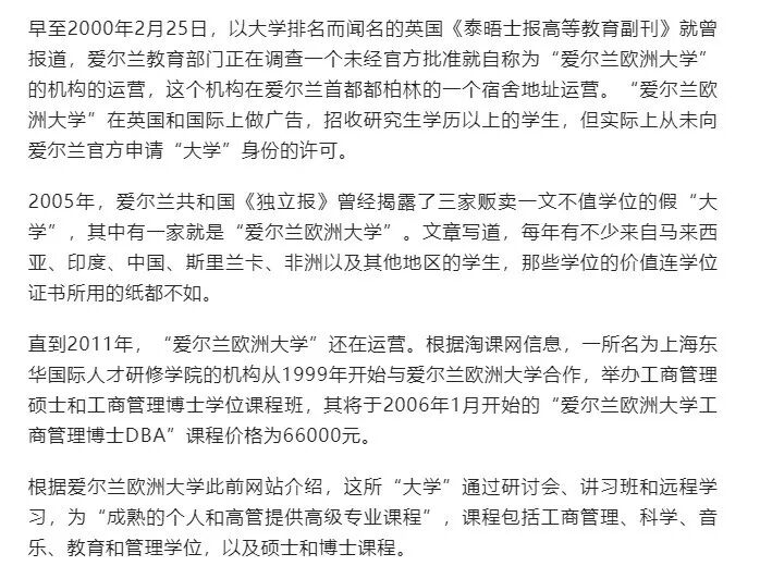 7月20日,天目新闻记者联系北京大学,该校宣传部工作人员称,目前学校已经关注到此事,但具体调查进展尚不清楚,不便透露。北大国发院值班人员称,对于此事最好联系本人,官方不便回应。记者尝试联系陈春花本人,截至发稿电话仍无人接听。据北京大学国家发展研究院官网信息显示,陈春花现任北大王宽诚讲席教授、北大国发院BiMBA商学院院长,研究领域涉及企业文化管理、组织行为学、中国企业成长模式研究等。曾两次获评《财富》“中国50位最具影响力商界领袖”;蝉联四届《财富》“中国最具影响力25位商界女性”。出版著作近30本,“领导力与高效能组织”线上课程曾入选首批国家级一流本科课程;曾三次获得教育部高等学校人文社科优秀著作奖。事情起源于2017年1月,陈春花所运营自媒体账号发表的一篇文章中,描述了2016年末,她与华为总裁任正非等交流的情景,包括任正非亲自为她当司机等内容,“令我惊奇的是,任先生自己开车做司机带我们过去,我和姚老师都说,这该是史上最贵的‘司机’......”。7月6日,华为发表声明指出,近期网络上有一万多篇夸大、演绎陈春花教授对华为的解读、评论,基本为不实信息。华为强调,“华为与陈春花教授无任何关系,华为不了解她,她也不可能了解华为”。7月6日,陈春花教授回应称,近期网络上有逾万篇夸大、演绎我对华为的解读、评论,基本为不实信息。相关文章并非本人所写,华为是本人的学术研究案例之一。拥有头衔众多的陈春花,1986年毕业于华南理工大学无线电系工学专业,获学士学位,此后于2000年获得新加坡国立大学企业管理研究生院工商管理硕士。而一年以后,即2001年,她已经拿到了“爱尔兰欧洲大学”工商管理博士。一年里完成了博士学位学习,看起来不合乎常理。而她所就读的“爱尔兰欧洲大学”,又到底含金量几何?早在2019年,社交媒体上,有网友问,“在陈春花教授毕业的爱尔兰欧洲大学读书是怎样的体验?”今年7月12日,有人回答:是一种在《围城》里当男主角的体验。钱钟书的小说《围城》中,主人公方鸿渐留学回国前,花三十美元向在美国的一位爱尔兰裔骗子买了一张“克莱登大学”的博士文凭。根据陈春花在华南理工旧版官网的简历,她就读的爱尔兰欧洲大学英文名为European University Ireland,学位是Doctor of Business Administration。目前已无法检索到这所学校的官网。而在一个名为“Degreeinfo(学位信息)”的论坛上面,2002~2009年间,一些学生分享他们搜集到的有关这所学校的信息,有人总结,这应该是个“文凭工厂”。首先,在我们教育部涉外监管信息网查询,经爱尔兰高等教育政府主管部门认可的正规大学有25所,其中并没有爱尔兰欧洲大学。其次,无论是百度还是谷歌等搜索引擎,都找不到该所大学的官方网页和信息。不仅如此,早在2000年,英国泰晤士报旗下以高等教育为主题的网站The Higher Education,就曾发表报道《调查“爱尔兰欧洲大学”》。文中提到,爱尔兰教育部门正在调查一个未经官方批准就自称为“爱尔兰欧洲大学”的行为。2005年,爱尔兰的独立报发表文章《曝光:假文凭丑闻》,揭穿了5家假大学、假文凭,其中就有“爱尔兰欧洲大学”。2011年,爱尔兰时报网站曝光了“爱尔兰欧洲大学”无牌照经营的现状。文中提到,该学校自称在都柏林市多米尼克大街1号运营,但在该地址并无设立办公室,该地址是另外一家合法的私立大学。还有媒体报道称:“爱尔兰教育部门也曾试图阻止其(爱尔兰欧洲大学)运作,但迄今未成功。”所谓的爱尔兰欧洲大学,可能就是一所给钱就能拿学位的野鸡大学。通过外国野鸡大学获得博士的陈春花,居然能够堂而皇之继续南京大学企业管理博士后,并且一路开挂,到华工和北大任职。7月9日,华南理工大学工商管理学院,没有对外界进行任何说明,便自行删除陈春花相关教育经历。说明相关大学均已知晓此事,然后就没有然后了。北大关于陈春花的教育背景,也仅仅写了:南京大学商学院企业管理博士后(2005),没有其他任何本硕博的文凭介绍。据《中国新闻周刊》了解,与陈春花差不多同期,即2000年之后的头几年,毕业于这所“爱尔兰欧洲大学”的高校教授,不只陈春花一人。在“教师库”、“经管之家论坛”等网站上,还能看到,华东某高校商学院一位教授的学历介绍也是“爱尔兰欧洲大学”管理学博士。目前,该校商学院的网站已经不能打开,但是该校其他学院的网页仍可正常获取。一位研究高等教育的学者表示,随着国家的治理,一些商业化、以获得文凭为目标的学位课程正在规范化,学历包装越来越少,不过,要彻底杜绝,还要有一个过程。另一位关注高等教育的教授也对《中国新闻周刊》指出,无论过去还是现在,学历包装都不同程度的存在。包装一旦过了头,涉及到学历真假问题,就是法律问题了。上海交通大学教授王桦宇告诉记者,这种现象在高校内不是首例,也不会是最后一例,很多人为了评奖评优以及职称评定,在面对正规大学博士攻读难度较大的情况之下,会选择去国外买一个“野鸡”大学的名头,这是非常不可取的做法。不过,随着国家在教育文凭方面的治理工作的深入,这种现象也发生得越来越少。前述科学史专家表示,当一个博士生花了几年时间、为了几篇论文常常感到“崩溃”时,一些人却用几万元钱就轻轻松松获得了“博士”学位,这显然是不公平的