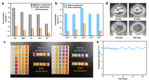 PZH-1的太阳能脱盐性能在墨西哥湾的真实海水水样中进行了评估。采用电感耦合等离子体质谱仪(ICP-MP)可以测定蒸馏水的质量。四种主要离子(Na+, Mg2+,K+,Ca2+,B3+)的浓度显著降低了2到4个级次(图5a),这符合世界卫生组织的饮用水标准,表明其在太阳能驱动的除盐方面的潜力。此外,PZH-1对含重金属离子(Cu2+、Ni2+、Zn2+、Co2+、Cr6+)的废水也具有良好的净水效果。净化后重金属离子浓度大幅下降(图5b)。此外,PZH-1在强酸(1 M H2SO4)和强碱(1 M NaOH)下表现出稳定的蒸发性能,收集水的pH值可以达到7(图5c),表明其在多种工作环境下的净化能力是稳定的。不同于以往的阻盐结构策略,水凝胶本身基于快速输水的能力表现出内在的抗盐污染行为。30分钟后,盐晶体(NaCl)消失(图5d)。同时,PZH-1在10 wt% NaCl溶液中的SVG率保持稳定3周,表明其良好的耐久性,在长期的太阳能脱盐中显示出良好的潜力。在这项研究中,作者开发了一类具有优良太阳能水蒸发SVG性能的PZHs,用于高效脱盐高盐度盐水。由于反聚电解质作用,盐水中的盐离子倾向于与相反的带电官能团相互作用。这种相互作用不仅产生了更水合的聚合物网络和更多的中间水以加速水蒸发,而且还产生了分层结构,以更快的水运输。在10%的盐水中,PZHs的SVG速率为4.14 kg m-2 h-1。同时,PZH蒸发器在去除废水中的盐分和重金属离子方面也具有良好的性能,并且具有长期的耐用性。https://onlinelibrary.wiley.com/doi/10.1002/ange.202208487