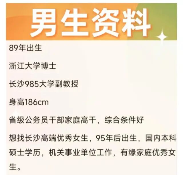 近日一名89年的浙江大学博士、长沙985大学副教授,要求寻找长沙体制内95后高学历女生。