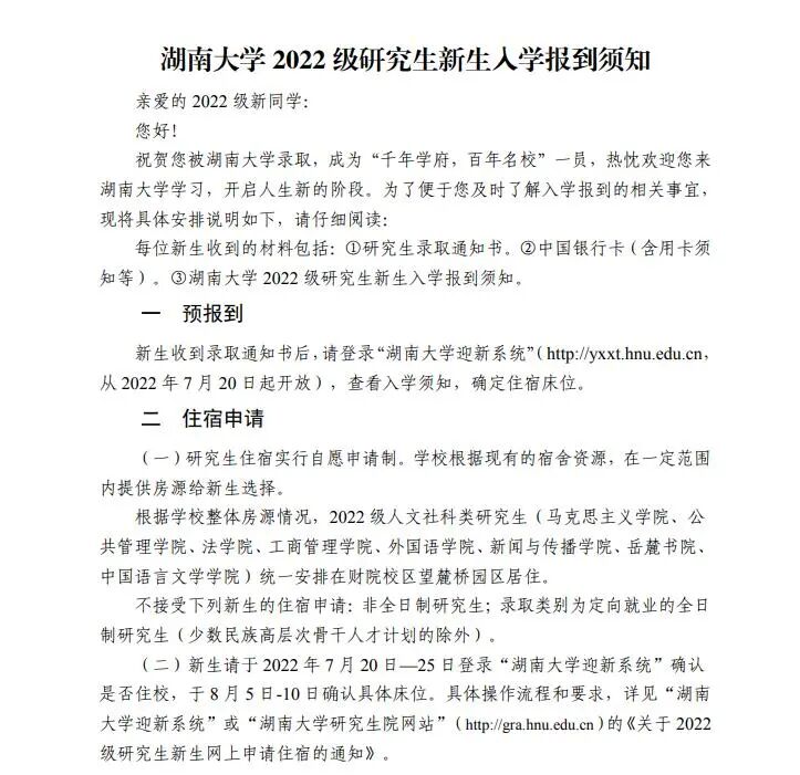 该份报到须知称:根据学校整体房源情况,2022级人文社科类研究生(马克思主义学院、公共管理学院、法学院、工商管理学院、外国语学院、新闻与传播学院、岳麓书院、中国语言文学学院)统一安排在财院校区望麓桥园区居住。而对于非全日制研究生和录取类别为定向就业的全日制研究生,则不接受申请(少数民族高层次骨干人才计划的除外)。